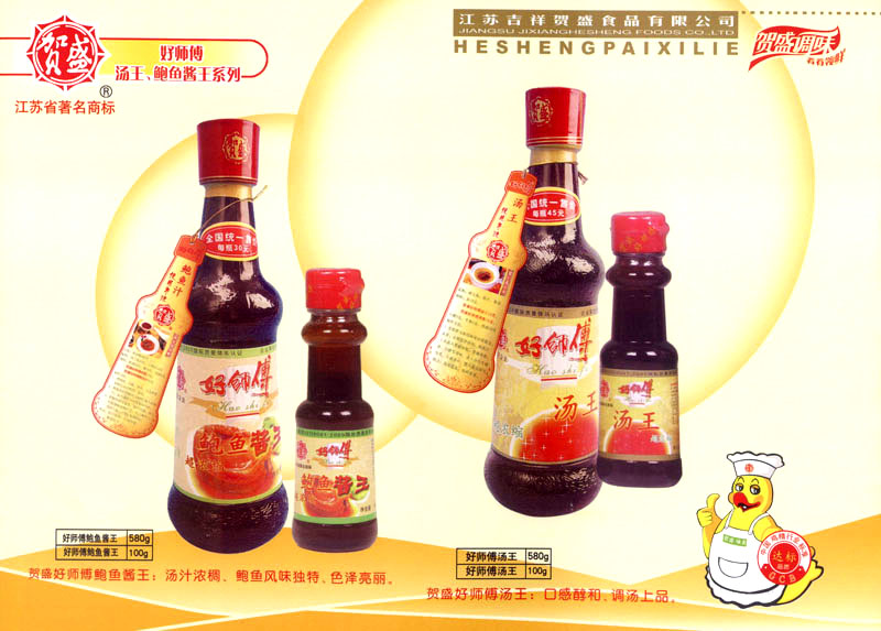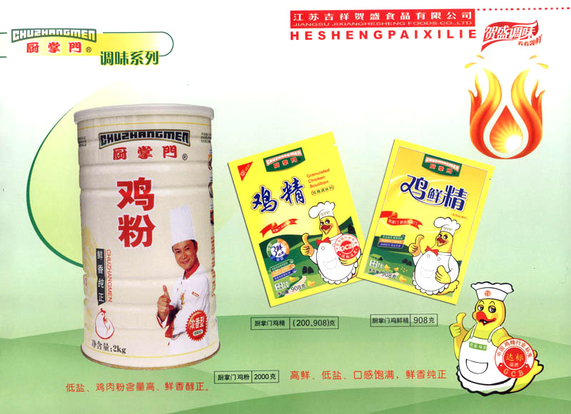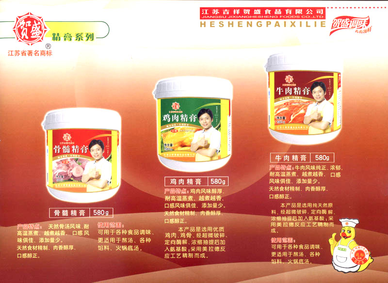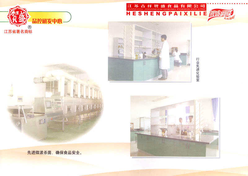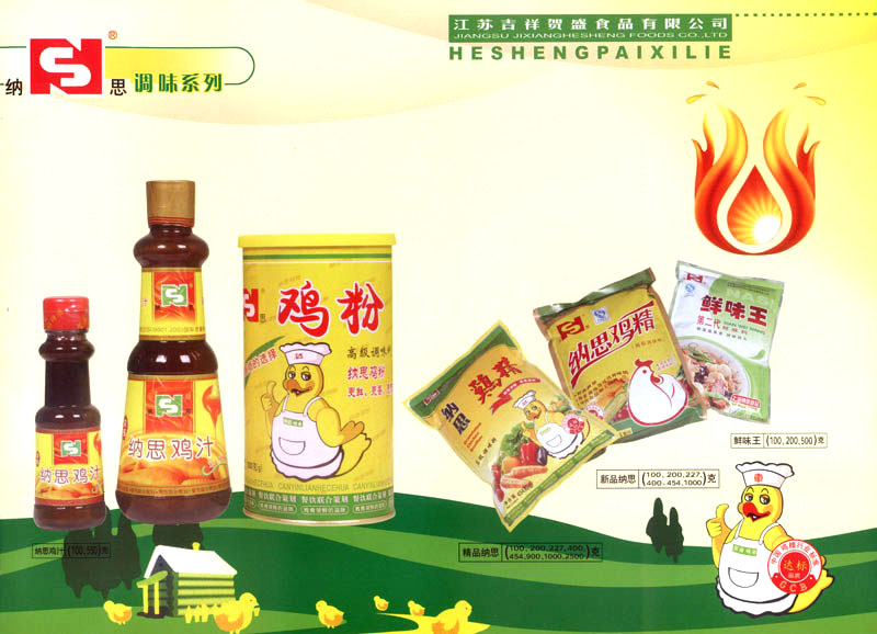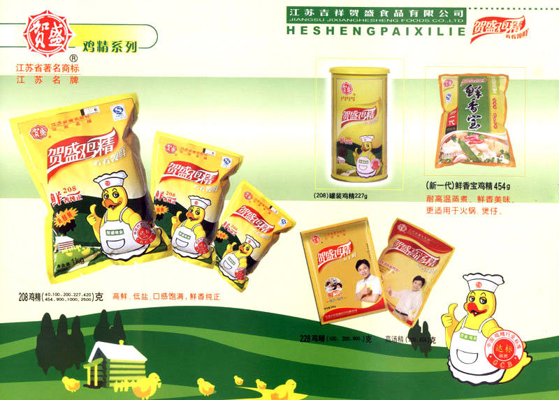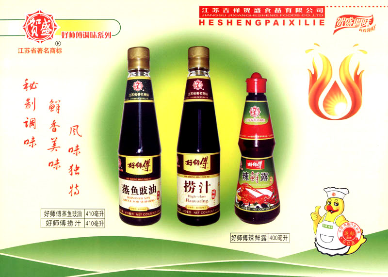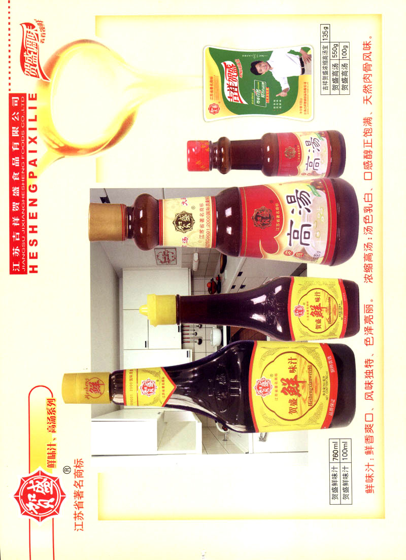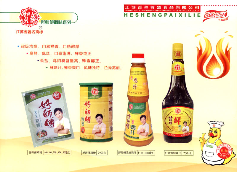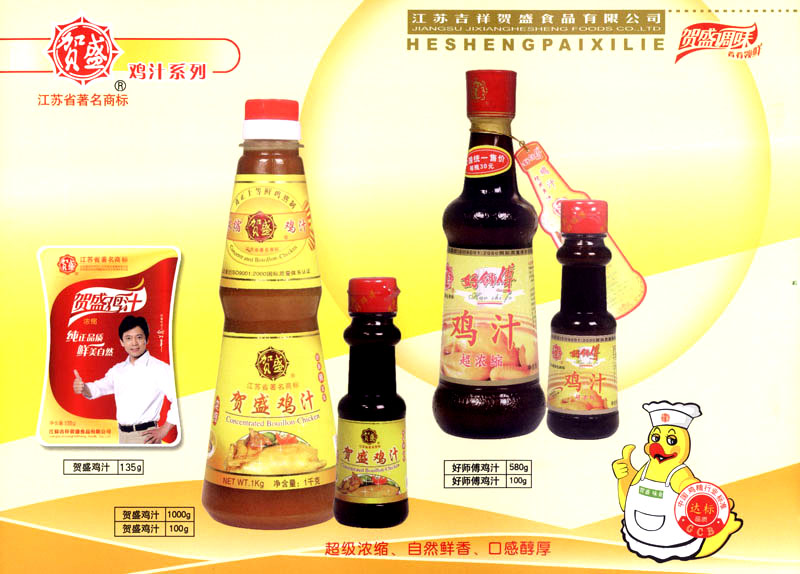 江蘇吉祥賀盛食品有限公司是一家中國專業(yè)餐料知名制造商,公司座落在經(jīng)濟高度發(fā)達(dá)“長三角”的常州市,緊靠312國道,滬寧高速與沿江高速交匯處,距常州火車站及長江水運碼頭20千米,交通十分便利。公司占地面積23500平方米,花園式工廠、廠房面積18500平方米,現(xiàn)在員工330余名,其中擁有中、高級職稱管理和技術(shù)人員58名,生產(chǎn)場地均按食品和藥品GMP要求設(shè)計、全封閉車間、中央空調(diào)系統(tǒng)、閉路電視監(jiān)控系統(tǒng)。目前已建成成三條雞精,雞粉生產(chǎn)線。一條雞汁生產(chǎn)線。一條鮮味汁生產(chǎn)線。一條醬汁精膏類生產(chǎn)線,規(guī)劃年生產(chǎn)能力達(dá)30000噸。 “賀盛”品牌取自《詩·大雅·下武》中“受天之祜、 四方來賀”;《易經(jīng)》中“富有謂之大業(yè),日新之謂盛德”,賀盛企業(yè)師法源遠(yuǎn)流長中華飲食文化,融匯中西健康美食調(diào)味。相繼研發(fā)生產(chǎn)出高品質(zhì)的“賀盛牌”味精、雞精、雞粉、雞汁、湯王、鮑魚醬王、鮮味汁調(diào)味素和各種風(fēng)味熱反應(yīng)精膏等系列產(chǎn)品。二十年來“賀盛”產(chǎn)品質(zhì)量獲得廚藝界專業(yè)人士和消費者的一致好評和高度認(rèn)可。 賀盛企業(yè)和產(chǎn)品相繼榮獲1995年“首界中國國際食品博覽會金獎”,2001年企業(yè)通過ISO-9001國際質(zhì)量體系認(rèn)證,2003年江蘇省“計量保證確認(rèn)單位”,2004年獲得自營出口權(quán),2005年賀盛雞精榮獲“江蘇名牌產(chǎn)品”,2006年賀盛商標(biāo)被評為“江蘇省著名商標(biāo)”,2007年通過HACCP認(rèn)證,全部產(chǎn)品均通過QS食品安全認(rèn)證,并積極努力爭創(chuàng)中國名牌,中國馳名商標(biāo)。 公司銷售網(wǎng)點建設(shè)發(fā)展迅速,相繼組建上海、南京、河南、海南、新疆全資分公司;辦事處、經(jīng)銷商覆蓋全國,并出口日本、香港及東南亞地區(qū)。二十年來,在公司總裁周國林先生帶領(lǐng)下,全體同仁秉承“厚德載物、自強不息”宗旨,發(fā)揚“以人為本、科技創(chuàng)新、自我加壓、爭創(chuàng)一流”的企求精神;致力于傳承中華飲食文化,融化西方美食精粹,不斷的研發(fā)、創(chuàng)新,奉獻更多更好的調(diào)味料,讓生活更有滋味。公司總裁周國林先生攜全體員工熱誠歡迎各位新老朋友蒞臨指導(dǎo),洽談合作!