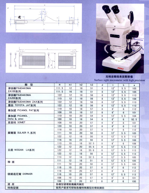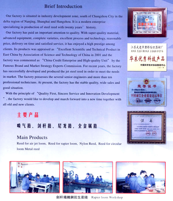 漕橋紡織器材廠位于常州市南郊寧、滬、杭金三角漕橋工業(yè)開發(fā)區(qū),是全國專業(yè)生產(chǎn)鋼筘規(guī)模較大的現(xiàn)代化廠家,已具有20年的歷史。 本廠生產(chǎn)的鋼筘有噴氣、劍桿筘、尼龍筘、圓織機筘和金屬筘分鉸筘、織帶筘、無梭織帶筘……本廠特別擅長生產(chǎn)高密度的劍桿筘。 本廠素以質(zhì)量為重,均采用優(yōu)質(zhì)材料制筘,如噴氣筘使用的筘片膠水鋁架等,均采用日本進口的材料;劍桿筘筘片采用日本進口的57B線材,膠水均采用紡織部定點的陜西紡織研究所生產(chǎn)的優(yōu)質(zhì)膠水、高密度劍桿筘均用進口膠水制筘;全金屬筘均用云南的優(yōu)質(zhì)錫制筘。 各種鋼筘筘面的平整度,筘齒的均勻度、垂直度,筘片的彈性度,膠水的牢固度廣大用戶使用后感到滿意放心,特別是使用壽命特別長,受到用戶一致的盛贊,真是料好筘好,筘好布好。 本廠為了使質(zhì)量精益求精,增添了不少先進設備,并聘請了數(shù)名高級工程師和十多位具有專業(yè)知識的技術人員把關。由于質(zhì)量穩(wěn)定可靠,2001年被中國科學技術協(xié)會評為“華東優(yōu)秀科技產(chǎn)品”二00二年被中國管理科學研究院名牌與市場戰(zhàn)略專家委員會評為“中國誠信企業(yè)質(zhì)量達標單位”。 今本廠產(chǎn)品暢銷全國20多個省市,價格優(yōu)惠,供不應求,形勢喜人。 本廠本著“以質(zhì)取勝、誠信服務、創(chuàng)新發(fā)展”的宗旨,愿與廣大新老客戶攜手共肩,昂首走進新時代,迎接新的挑戰(zhàn)。