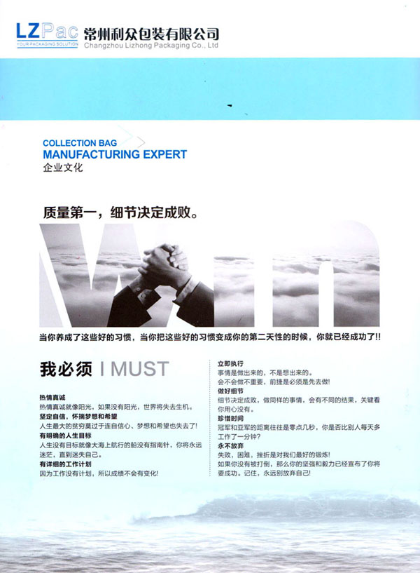 常州利眾包裝有限公司成立于2009年。經(jīng)過10多年的發(fā)展,已發(fā)展成為規(guī)模型的集成袋生產(chǎn)與研發(fā)基地。公司擁有四條拉絲生產(chǎn)線,20余臺各式圓織機(jī)、10余臺織帶機(jī),1臺寬幅涂膜機(jī),10余臺自動裁剪機(jī),200多臺各式縫紉設(shè)備,其中電腦縫紉設(shè)備多達(dá)40多臺。公司月產(chǎn)各種中高檔集裝袋20萬條左右。 擁有強(qiáng)大的質(zhì)量管理系統(tǒng)。公司成立初期就通過了ISO9001的體系論證。公司奉行“質(zhì)量第一,客戶至上”的經(jīng)營理念,始終堅(jiān)持以質(zhì)量謀發(fā)展的原則,執(zhí)著追求以新工藝,新設(shè)備,高效率不斷優(yōu)化生產(chǎn)流程,降低生產(chǎn)成本以適應(yīng)市場。常州利眾包裝有限公司地處美麗的江南水鄉(xiāng)——常州。地理位置十分優(yōu)越。 公司主打產(chǎn)品為各種中高端集裝袋。包括各式拉筋袋,導(dǎo)電袋,抗靜電袋。公司客戶清單中包括有很多的國際知名企業(yè),世界500強(qiáng)企業(yè)。 眾包裝——你的包裝解決方案。