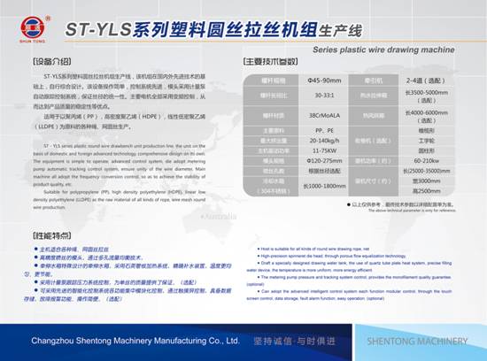 常州神通機(jī)械制造有限公司位于滆湖之盼,依托常州市武進(jìn)區(qū)優(yōu)越的地理環(huán)境,公司創(chuàng)建于1992年,是專業(yè)生產(chǎn)塑料機(jī)械拉絲機(jī)成套設(shè)備的企業(yè)。 神通公司經(jīng)過30年多來的艱辛創(chuàng)業(yè),在塑料機(jī)械行業(yè)中積累了豐富的經(jīng)驗(yàn),為擴(kuò)大生產(chǎn)能力,提升產(chǎn)品質(zhì)量,新組建了一個(gè)技術(shù)緊密合作型企業(yè),并具有獨(dú)立法人資質(zhì),即為宜興順通機(jī)械制造有限公司。我們會一如既往地努力,堅(jiān)持走“順通”的品牌之路,愿與各位同行攜手共創(chuàng)未來,為塑料機(jī)械行業(yè)的發(fā)展作出貢獻(xiàn)。 神通公司擁有標(biāo)準(zhǔn)廠房共計(jì)15000m²,現(xiàn)有先進(jìn)的三軸、四軸聯(lián)動的加工中心,數(shù)控鉆床、銑床、車床、外圓磨床、剪板機(jī)、折彎機(jī)等高精度加工設(shè)備。 神通公司以精湛的生產(chǎn)工藝、完善的管理體系和滿意的售后服務(wù),得到新老用戶的信賴。設(shè)備外形美觀、結(jié)構(gòu)合理、性能安全可靠、具有先進(jìn)的控制系統(tǒng)等優(yōu)點(diǎn),物美價(jià)優(yōu),得到新老用戶的一致好評。 神通公司對產(chǎn)品質(zhì)量要求是:從原材料采購到成品出廠,均執(zhí)行品質(zhì)控制。 神通公司堅(jiān)持“以人為本、誠信經(jīng)營、科技興業(yè)、精益求精、以質(zhì)取勝、合作共贏”的經(jīng)營理念!耙再|(zhì)量求生存,以創(chuàng)新求發(fā)展”的企業(yè)精神。 主營業(yè)務(wù): 1.雙色人造草坪單絲、雙色人造草坪曲絲一步法、人造草坪開網(wǎng)絲拉絲成套生產(chǎn)線設(shè)備系列,及草坪絲一步法捆綁收卷機(jī)、一步法捻線機(jī)、絡(luò)筒機(jī)。 2.PE、 PP、 PA、PET圓絲、工業(yè)單絲等拉絲成套生產(chǎn)線設(shè)備系列。 3.集裝袋、編織袋、土工布、PP基布、遮陽網(wǎng)、捆草網(wǎng)、蓋土網(wǎng)等平膜扁絲拉絲機(jī)成套生產(chǎn)線設(shè)備系列。 4.電纜填充網(wǎng)狀絲、PP縱向拉伸膜、PE壓花膜成套生產(chǎn)線設(shè)備系列,及各種特殊規(guī)格的電纜填充繩收卷機(jī)等電纜材料輔助設(shè)備5.高低壓PP,PE吹膜機(jī)及撕裂膜、捆扎帶生產(chǎn)線設(shè)備系列。 6.塑料回收造粒機(jī)組、邊絲回收裝置及粉碎機(jī)等。 7.圈、扁絲磁性收卷機(jī)、變頻無刷電機(jī)收卷機(jī),圓絲工字盤、橄欖形、寶塔形收卷機(jī)及浸膠線專用收卷機(jī)。 8.舊塑料拉絲機(jī)設(shè)備改造、可定做特殊規(guī)格的圓、扁絲帶捻度專用收卷機(jī)、繩網(wǎng)絡(luò)筒機(jī)及其它收卷機(jī)。