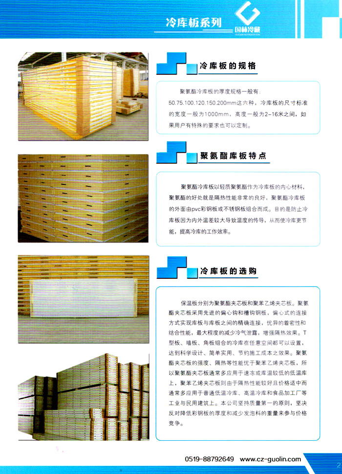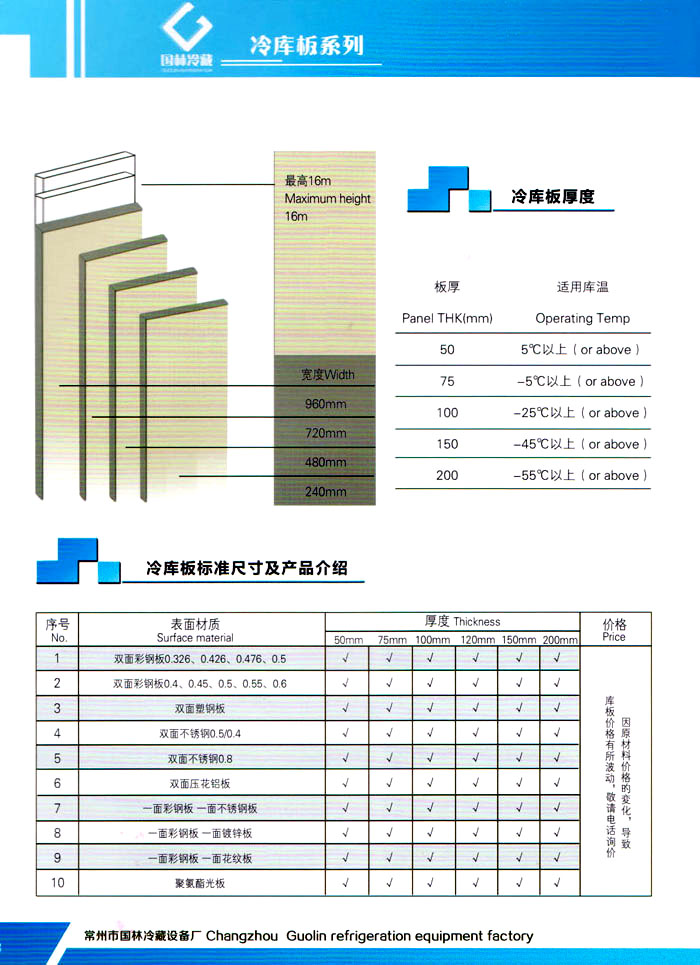 常州市國(guó)林冷藏設(shè)備廠(原武進(jìn)長(zhǎng)虹冷藏設(shè)備廠)成立于1995年,地處江南水鄉(xiāng)中國(guó)富饒的“長(zhǎng)江三角洲”中心區(qū)域—江蘇常州,滬寧高速、沿江高速、312國(guó)道,交通快捷,即刻到達(dá)。 國(guó)林冷庫(kù):公司通過了ISO9001:2000質(zhì)量體系認(rèn)證,國(guó)林冷庫(kù)多次獲得“江蘇省優(yōu)質(zhì)產(chǎn)品”稱號(hào),全國(guó)質(zhì)量服務(wù)AAAAA示范單位,并且是中國(guó)食品網(wǎng)、阿里巴巴,空調(diào)制冷誠(chéng)信通會(huì)員企業(yè),并與全國(guó)多家設(shè)計(jì)院技術(shù)合作,本廠的誠(chéng)信服務(wù)獲得了廣大客戶的認(rèn)可。 國(guó)林冷庫(kù):中國(guó)制冷行業(yè)的十大冷庫(kù)制造商之一,中國(guó)制冷重要工業(yè)生產(chǎn)基地。本公司***生產(chǎn)保溫庫(kù)板及冷庫(kù)制冷成套設(shè)備,庫(kù)板材料涉及不銹鋼、彩鋼板、玻璃鋼板、保溫聚氨脂板。年產(chǎn)量3000多臺(tái),庫(kù)板30多萬平方,歡迎新好客戶前來訂購(gòu)。 國(guó)林制冷:公司始終堅(jiān)持:“質(zhì)量為上,追求品質(zhì)”的生產(chǎn)方針;始終信奉:“客戶為先,服務(wù)為本”的經(jīng)營(yíng)理念。我們?cè)竿瑥V大的新老客戶在新的世紀(jì)里,共同發(fā)展,利益雙贏,再創(chuàng)輝煌。 常州市國(guó)林冷藏設(shè)備廠***生產(chǎn)7.5公分,10公分,12公分,15公分,20公分的聚氨酯冷庫(kù)板,面板包括彩鋼板、不銹鋼板、壓花鋁板等各種板材,各種冷庫(kù)半埋門及平移動(dòng)門,各種鐵排管和鋁排管,價(jià)格優(yōu)惠,有需要的可以聯(lián)系我金文燁18761183807
