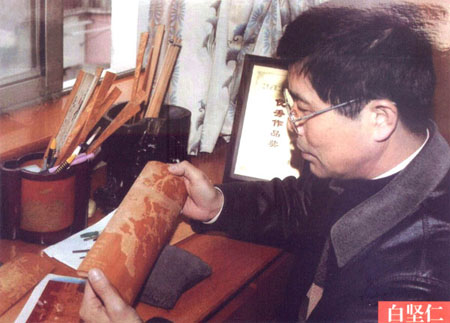 白堅(jiān)仁,1956年生于江蘇常州,國家級(jí)非物質(zhì)文化遺產(chǎn)、江蘇省級(jí)傳承人、江蘇省名人,高級(jí)工藝美術(shù)師,是留青竹刻泰斗白士風(fēng)之子。從小深受先父的熏陶和指點(diǎn),寒來署往、夜以繼日,不僅學(xué)到了先父厚樸豁達(dá)的品格,更深得先父竹刻藝術(shù)的真諦。除繼承刻有先父創(chuàng)立的橫臺(tái)屏、筆筒等作品外,更注重作品的創(chuàng)新。多年來,經(jīng)過艱辛的探索和反復(fù)的實(shí)踐,努力吸取姐妹藝術(shù),成功地采用了多片拼裝,配上紅木框架,制成大型的圖文并貌的作品,如帽籠、大插屏、鏡框掛件、四條屏、甚至中堂。在構(gòu)圖內(nèi)容、技法變化、裝幀形式等方面,都走出了創(chuàng)新之路,使所制作品適應(yīng)了現(xiàn)代人們的審美情趣和生活需求,實(shí)現(xiàn)了多年來要使留青竹刻與書畫作品同樣也能懸掛于廳堂之上的愿望。作品多次在國內(nèi)、國際展覽中獲獎(jiǎng),并獲得了留青竹刻史上的首位二項(xiàng)國家專利擁有者。