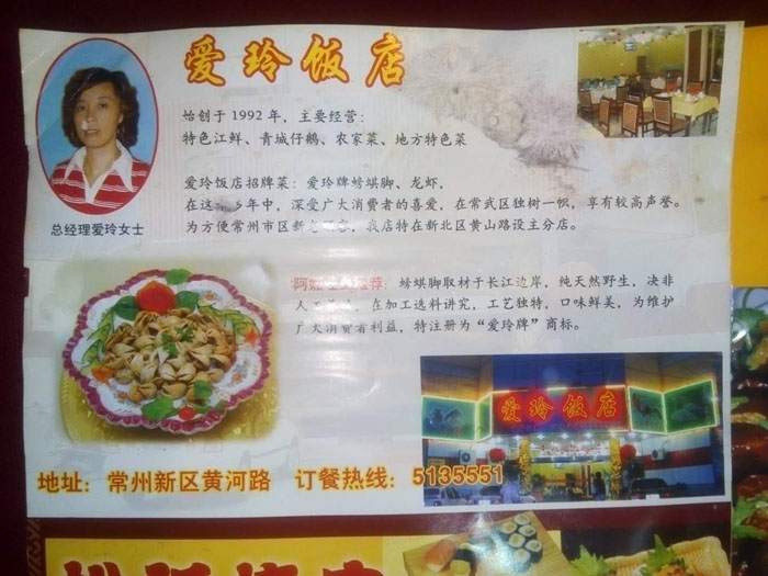 愛玲飯店招牌菜:愛玲牌螃蜞腳、龍蝦,在這十多年中,深受廣大消費(fèi)者的喜愛,在常武區(qū)獨(dú)樹一幟,享有較高聲譽(yù)。為方便常州市區(qū)新老客戶,我店在新北區(qū)黃山路設(shè)主分店。
