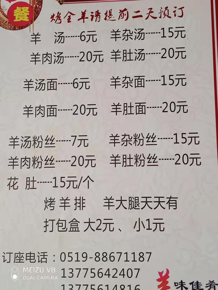 武進區(qū)鄭陸寧河全羊館從事羊肉經(jīng)營四十年,羊館經(jīng)營面積300平方米,從羊頭到羊蹄都能做菜:羊頭、羊排、羊拐、羊蹄、羊耳,其他還有羊羔,烤羊,羊湯面,清水羊肉,全羊宴。羊肉湯只是白煮,湯白而濃稠,肉爛味鮮,還不腥不油不膩。你若細(xì)看菜單就能發(fā)現(xiàn),全羊席幾乎都是拿燉湯帶出來的,這更加顯示出羊肉湯的魅力。 我們結(jié)合現(xiàn)代人飲食文化的特點,以考究的投料,精細(xì)的制作工藝,調(diào)出的全羊湯,湯汁乳白、鮮而不膳、香醇不膩、味道鮮美,具有補虛壯陽、溫中暖下之功效。