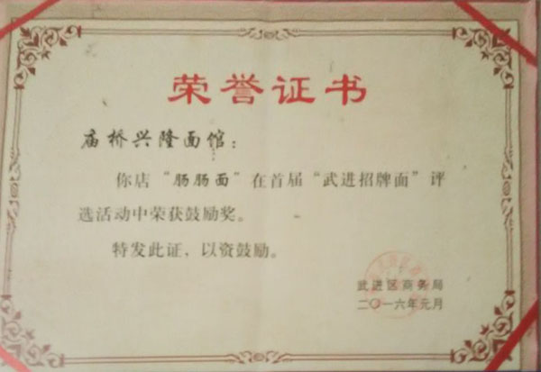 廟橋腸腸面館(原廟橋興隆面館)從事面條軋制及各色蓋澆面的經(jīng)營已有40多年,穿過喧囂的廟橋集鎮(zhèn)區(qū),拐進一條略顯狹窄的道路,兩旁的小吃店突然多了起來,廟橋興隆面館就處在最中間。面館門面并不大,甚至店招牌還有些陳舊,七八張桌子整齊地排在店內(nèi)。面館特色是紅燒腸腸面,現(xiàn)有推出真空包裝腸腸的銷售,面積有100平方米左右。 對于食客而言,一碗腸腸面就是一次美味享受。但對于店家而言,卻是許多個夜晚辛勤的付出。每天凌晨2點半起床,洗凈大腸、烹制成品,之后熬制面湯。早晨5點半,會迎來第一批客人,一直要忙活到9點才可稍微休息。中午和晚飯時間還需一陣忙碌,期間還得趕往相關收購點購買大腸?梢哉f,每天都是輪軸轉,休息時間不足7小時。 連續(xù)幾十年的忙碌,金祖德感到了力不從心,但他不希望手藝就此失傳。于是,他找到了尚惠平,希望能傳承這門生意。勤勞、踏實、肯干的尚惠平扛起了這份重任,經(jīng)過兩個多月的學習琢磨,最終成功將腸腸面的工藝、手法全盤繼承。 “面條是手搟面,腸腸也是經(jīng)多輪清洗烹制而成,一句話,要讓市民吃得放心!鄙谢萜秸f,接手8年多以來,面館生意延續(xù)紅火態(tài)勢,每天至少要吃掉100斤豬腸。 如今,尚惠平也已年過六十,“傳承”兩字又一次被提上議程。令人欣喜的是,能吃苦的兒子和兒媳十分喜歡這門手藝,一家興隆面館分店也已在學府東苑社區(qū)營業(yè)。這里有一樣的味道、一樣的面條,還有一樣的記憶、一樣的辛勞,在傳承與發(fā)展間,這家興隆面館或將真正成為百年老店。