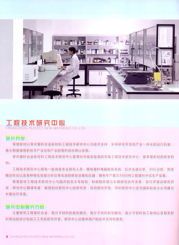 公司建設(shè)年產(chǎn)3萬噸工程塑料生產(chǎn)基地,生產(chǎn)各種阻燃ABS、耐熱ABS樹脂、工程塑料合金、功能高分子材料以及塑料助劑等產(chǎn)品。