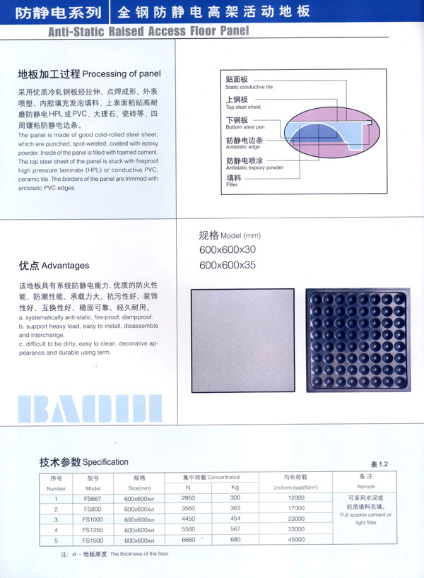 常州市寶進(jìn)防靜電設(shè)備有限公司是各類(lèi)防靜電產(chǎn)品開(kāi)發(fā)、設(shè)計(jì)、制造、安裝服務(wù)于一體的企業(yè)。以上海物理學(xué)會(huì)空間靜電專(zhuān)業(yè)委員會(huì)強(qiáng)大的技術(shù)力量為后盾。公司主要致力于各類(lèi)機(jī)房、電氣室設(shè)計(jì)、安裝;各類(lèi)防靜電干擾處理及用戶(hù)特種需求。公司擁有防空間靜電干擾—聲學(xué)復(fù)合系統(tǒng)、輕質(zhì)全鋼活動(dòng)地板、高環(huán)保型抗靜電貼面等多項(xiàng)發(fā)明專(zhuān)利,是國(guó)內(nèi)該行業(yè)中唯一擁有自主知識(shí)產(chǎn)權(quán)的企業(yè)。 公司主要產(chǎn)品“寶迪”牌 防靜電高架地板及板材、OA網(wǎng)絡(luò)地板。產(chǎn)品廣泛用于電子廠房、金融系統(tǒng)、電力、廣電、軍隊(duì)及智能化樓宇。并向多個(gè)國(guó)家出口。 針對(duì)發(fā)泡水泥填充的全鋼高架地板自身重、承載差的缺點(diǎn),我們開(kāi)發(fā)了輕質(zhì)全鋼高架地板。在提前地板承載的同時(shí),大幅減輕了地板的自重。 公司一貫嚴(yán)格執(zhí)行ISO9001-2000質(zhì)量保證體系,為用戶(hù)提供高品質(zhì)的產(chǎn)品及完善的售后服務(wù)是公司一貫的宗旨。