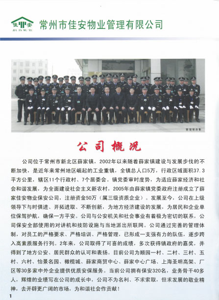 佳安物業(yè)管理有限公司位于常州市新北區(qū)薛家鎮(zhèn),2005年由薛家鎮(zhèn)黨委政府注冊(cè)成立,注冊(cè)資金50萬元,屬于三級(jí)資質(zhì)企業(yè)。成立之初,佳安物業(yè)作為政屬事業(yè)單位,主要負(fù)責(zé)管理薛家鎮(zhèn)順園新村安置小區(qū)。隨著薛家鎮(zhèn)經(jīng)濟(jì)和人口的發(fā)展,為主動(dòng)適應(yīng)經(jīng)濟(jì)發(fā)展新常態(tài),全面深化物業(yè)綜合改革,打造具有薛家特色的物業(yè)公司,佳安物業(yè)由政府下屬的事業(yè)單位正式轉(zhuǎn)變?yōu)楠?dú)立運(yùn)營的企業(yè),并增資到1000萬元。 2017年6月,公司通過審核被評(píng)為“AAA”級(jí)信用企業(yè),同月,公司實(shí)施ISO9001質(zhì)量管理體系標(biāo)準(zhǔn),并于8月通過質(zhì)量體系認(rèn)證審核。2018年8月,公司通過了ISO14001環(huán)境管理體系、ohsas18001職業(yè)健康安全管理體系的認(rèn)證審核。 目前,公司主要承接小區(qū)物業(yè)服務(wù)及廠區(qū)外派保安服務(wù)、保潔服務(wù)等,F(xiàn)公司為薛家鎮(zhèn)順園一村至順園九村安置小區(qū)及奧林匹克花園、怡景名園2處商業(yè)小區(qū)提供物業(yè)服務(wù);為江南農(nóng)村商業(yè)銀行新北區(qū)所有支行、中車鐵馬、投資服務(wù)中心、華夏藝博園、薛家幼兒園、薛家小學(xué)及薛家中學(xué)等單位提供外派保安服務(wù);為薛家鎮(zhèn)中心廣場及松林別墅提供保安服務(wù);為華夏藝博園及投資服務(wù)中心提供保潔服務(wù)等。 在這十余年中,佳安物業(yè)與時(shí)俱進(jìn),銳意進(jìn)取,為地方建設(shè)發(fā)展注入動(dòng)力,為居民和企業(yè)安全保駕護(hù)航,尤其是在實(shí)踐中,我們積極探索,正逐步摸索出一條適合薛家城鄉(xiāng)一體化建設(shè)的社區(qū)物業(yè)管理的新路。希望通過今天的分享,和大家一起探討我們?cè)凇肮苻k分離”等方面的實(shí)踐經(jīng)驗(yàn),并在此基礎(chǔ)上為薛家的可持續(xù)發(fā)展提供可借鑒、推廣的新型物業(yè)管理之路。