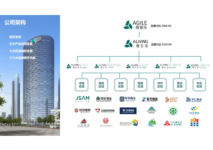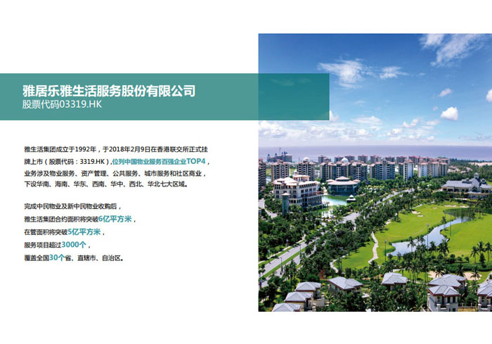 “人是雅居樂關注的核心,雅居樂不僅要蓋好房子,更希望全方位呵護業(yè)主的一生! 2015年,雅居樂集團重新定義社區(qū)服務理念,以聯(lián)動發(fā)展模式,整合最優(yōu)質(zhì)的社區(qū)資源,為業(yè)主提供全面的居家生活解決方案。因此,雅居樂集團“1+N”多元發(fā)展戰(zhàn)略規(guī)劃下的首個產(chǎn)業(yè)集團——雅生活集團應運而生。目前雅生活集團已集結(jié)物業(yè)、科技、旅游、廣告、營銷、驗房六大業(yè)務艦隊。2018年2月9日,雅生活集團正式在香港聯(lián)合交易所主板掛牌上市(股票代碼03319.HK),成為中國首家紅籌分拆H股的物業(yè)服務企業(yè)。