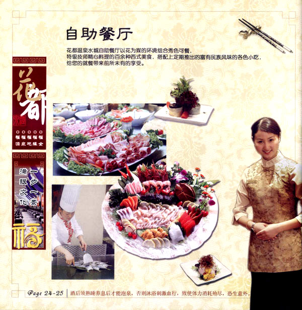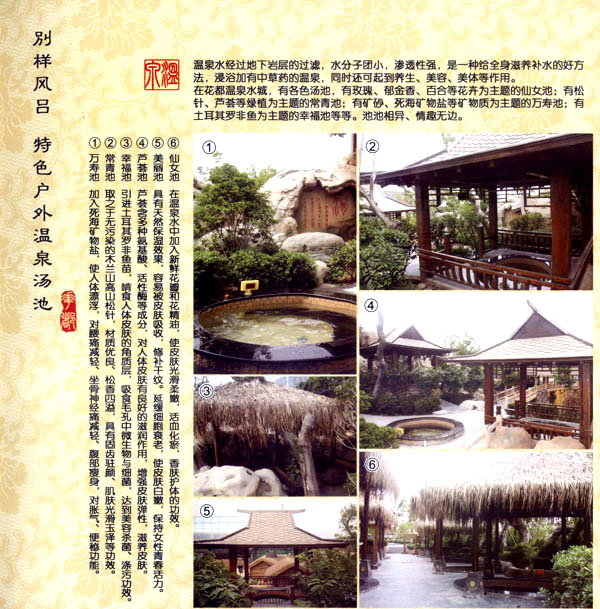 淹城花都溫泉水城孕育天地之精華,悅身、悅?cè)、悅心、悅神。置身其中泉水潺潺,霧氣繚繞、花瓣飄香,恍若仙境!稗渌略谑郑ㄏ銤M衣”,花都溫泉的浪漫與溫潤(rùn)在這里完美展現(xiàn)。 花都溫泉水城包括洗浴區(qū)、戲水世界、露天溫泉、自助餐廳、生態(tài)房、別墅區(qū)、紅文化房、VIP區(qū)等多種功能區(qū)域,是集溫泉養(yǎng)生、休閑住宿、演藝會(huì)務(wù)為—體的休閑度假勝地,給賓客帶來江南小鎮(zhèn)的浪漫水城之旅。 古木新枝畔賓客對(duì)酒當(dāng)歌,溪泉石椅旁把茶品啜。 淹城-三勤生態(tài)酒店,這里是一處綠色生態(tài)的美食家園。此地鬼斧神工.奇水異石,和風(fēng)細(xì)雨林中穿過,引百鳥朝來暮歌;這里集生態(tài)餐飲、演藝、中小型會(huì)務(wù)為一體,將現(xiàn)代裝飾風(fēng)格和古雅拙樸的自然裝修完美整合;這里聚集大江南北名廚,推出精致綠色美昧佳肴。來到這里,賓客可享田園至美之景,品舌尖至鮮之味,實(shí)乃人生一大樂事。