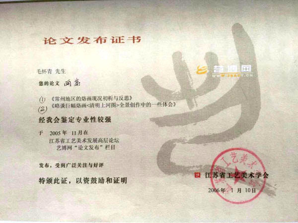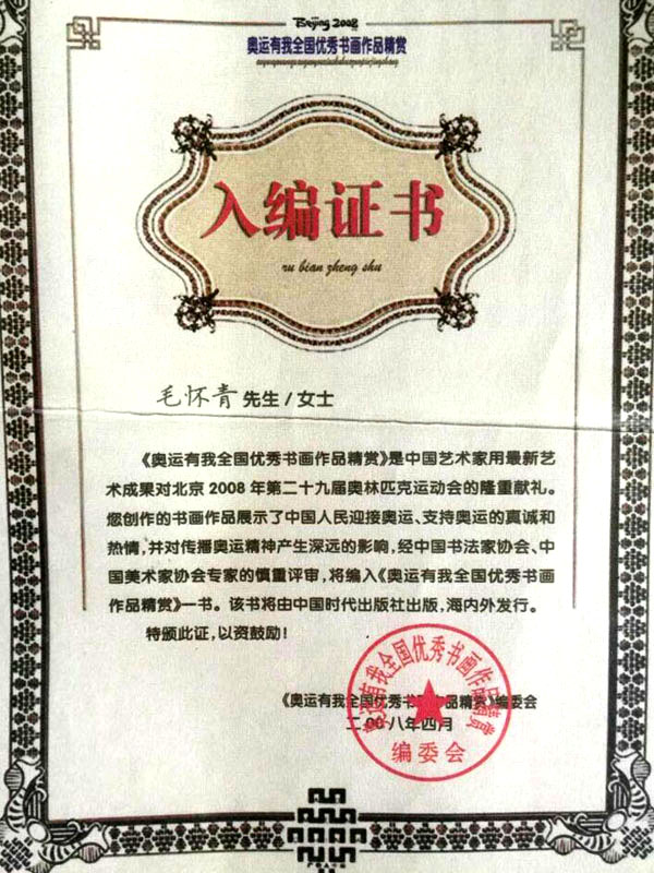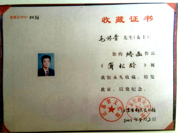 毛懷青,江蘇常州市武進(jìn)人。 中國工藝美術(shù)學(xué)會(huì)會(huì)員,常州市中國烙畫研究會(huì)副會(huì)長,常州市文博鑒賞協(xié)會(huì)理事,非物質(zhì)文化遺產(chǎn)烙畫傳承人。高級工藝美術(shù)師。 年輕時(shí)學(xué)習(xí)國畫、油畫中年蔓現(xiàn)掌州咯畫源遠(yuǎn)流長、歷史悠久,有著其它美術(shù)門類不具備的藝術(shù)風(fēng)格與特色?芍^是工藝美術(shù)中的一朵十分亮麗的藝術(shù)奇葩,是我民族先人給我們留下的一份不可多得十分珍貴的一份文化遺產(chǎn)。為弘揚(yáng)與發(fā)展這份優(yōu)秀文化遺產(chǎn),我從此下定決心研究烙畫,愿付出一份力量為振興烙畫事業(yè)做出貢獻(xiàn)。至今已潛心研究幾十年,取得了可喜的成績,被業(yè)界公認(rèn),社會(huì)關(guān)注與認(rèn)可。有“江南烙畫第一筆”之美譽(yù)。 近年來,創(chuàng)作的烙畫作品分別獲得過全國、省市級的金、銀、銅獎(jiǎng)多次。中央電視臺(tái)曾兩次播放過本人的烙畫作品,江蘇電視臺(tái)、常州電視臺(tái)也曾多次播放過本人的作品與烙畫藝術(shù)生涯,揚(yáng)子晚報(bào)、常州日報(bào)、常州晚報(bào)也曾多次報(bào)導(dǎo)過本人的烙畫作品,出版物有三種版本都能查閱到介紹本的烙畫從藝生涯與藝術(shù)業(yè)績。