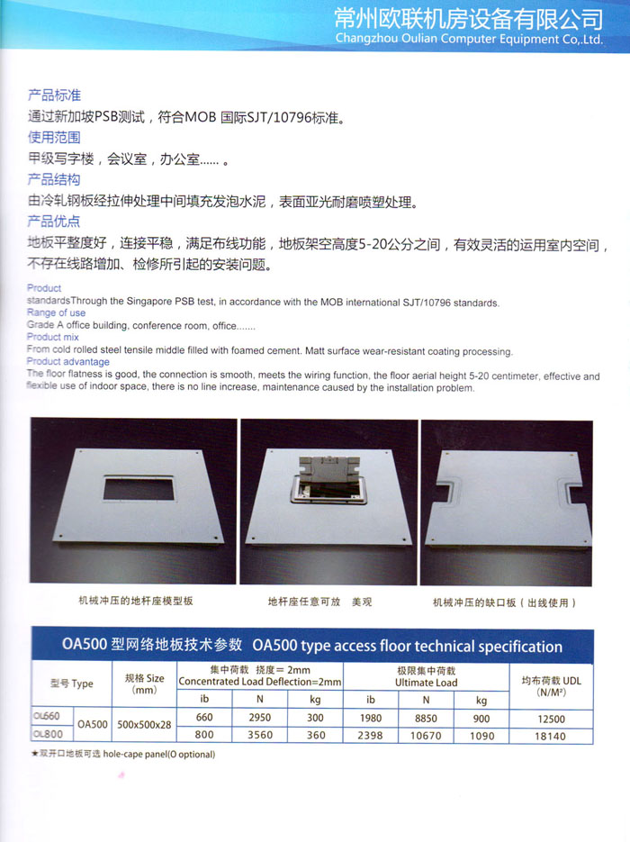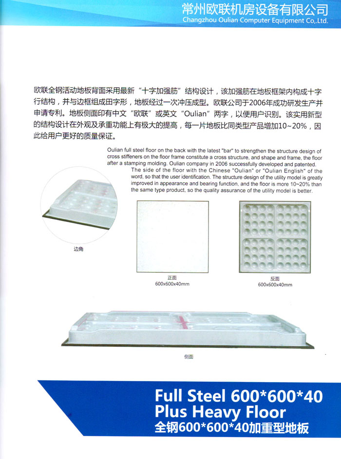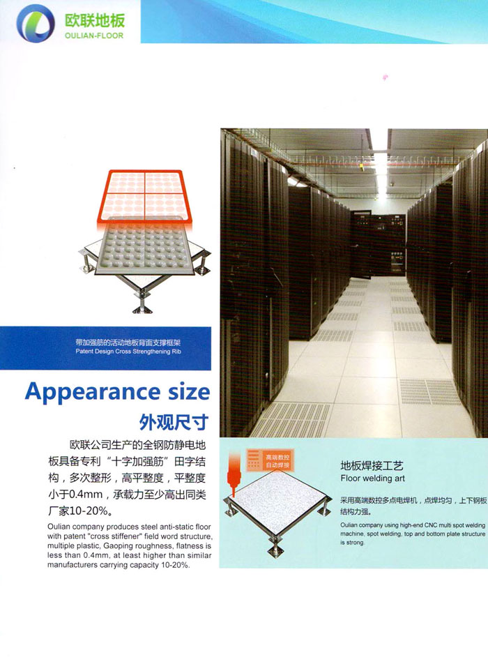 防靜電高架活動地板、全鋼地板、陶瓷地板是計算機行業(yè)發(fā)展起來的新型鋪地材料,隔離了潮氣、靜電灰塵,最重要的是解決了綜合布線問題,無需預埋管線,可隨時拆卸、搬移,保證了資訊設備完整的優(yōu)點,適應了智能化樓宇中信息自動化技術對所處環(huán)境的特定要求,避免了廣大客戶的雙重投資,使現(xiàn)代化辦公程度更加高效,辦公場所更加舒適。 “歐聯(lián)”系列全鋼地板,符合國家安全要求,種類完備多樣,其中防靜電陶瓷地板、硫酸鈣地板等除具有普通瓷質的裝飾和實用性外,其耐磨、防水、防火功能優(yōu)于其它同類產(chǎn)品,防靜電系列地板,能切合不同客戶的要求,其靈活的配置,深受客戶歡迎,不同材質的地板結構使設計師的設計空間比傳統(tǒng)的更加廣闊自由和善變。 公司大力發(fā)展國內(nèi)外銷售業(yè)務,多次中標國內(nèi)重點工程 ,例:哈爾濱醫(yī)科大學、山東大學、上海普通機場等。 公司將一如既往開發(fā)和制造一流的產(chǎn)品,愿與廣大有識之士合作發(fā)展,共創(chuàng)美好未來。