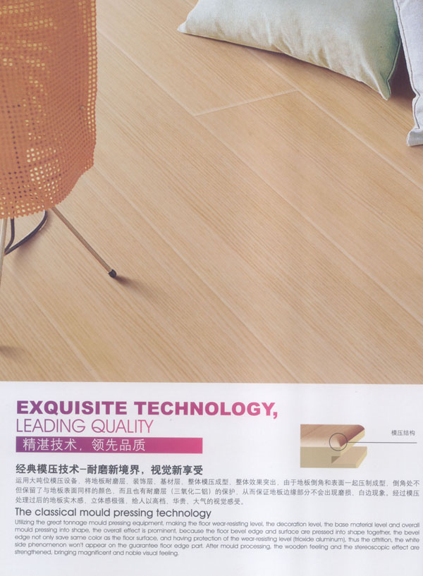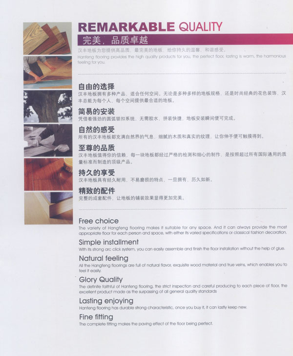 常州漢豐裝飾材料有限公司是一家涉及強化地板制造、屏風鋁材生產(chǎn)、進出口貿易的大型公司。2001年公司投入重資.全面引進世界頂級一體化自動流水生產(chǎn)線和具有國際先進水準的德國權威木地板生產(chǎn)技術,興建強化地板生產(chǎn)基地。多年以來.一直不斷加強生產(chǎn)設備、廠房基礎投入,目前公司年生產(chǎn)強化地板能力已經(jīng)達到了500萬平方米,步入國內一流行列,具備了雄厚的國際競爭力。 漢豐地板以奉獻生活中最完美的地板為發(fā)展目標,時尚流行的設計風格和多樣化的產(chǎn)品類型,贏得了市場的廣泛贊譽和肯定。產(chǎn)品嚴格按照歐洲標準檢測強化木地板的各項性能指標.達到百分百的國際技術標準,確保了每一塊地板都有著上乘品質,是綠色環(huán)保的好地板。并先后通過了Isc)9001國際質量管理體系認證,IS014001國際環(huán)境管理體系認證.中國環(huán)境標志產(chǎn)品認證,深得用戶的一致好評,是寫字樓、商場、大型超市、學校、建筑樓宇、娛樂場所、家用私宅等鋪裝的首選地板。