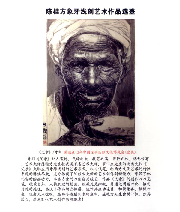 陳桂方,江蘇常州武進(jìn)人,中國(guó)著名雕刻藝術(shù)家,江蘇省工藝美術(shù)大師、研究員級(jí)、高級(jí)工藝美術(shù)師,江蘇省非物質(zhì)文化遺產(chǎn)《象牙淺刻》代表性傳承人。畢業(yè)于中國(guó)書(shū)畫(huà)函授大學(xué),深造于清華大學(xué)、南大美術(shù)系,現(xiàn)任中國(guó)工藝美術(shù)協(xié)會(huì)會(huì)員,江蘇省工藝美術(shù)學(xué)會(huì)理事,常州市工藝美術(shù)家協(xié)會(huì)副秘書(shū)長(zhǎng),常州市工藝美術(shù)行業(yè)協(xié)會(huì)常務(wù)理事,武進(jìn)工藝美術(shù)協(xié)會(huì)副主席。陳桂方大師淺刻作品的藝術(shù)特點(diǎn):山水氣韻生動(dòng),氣勢(shì)磅礴,場(chǎng)面壯觀,刀法細(xì)膩:人物仕女生動(dòng)可人,栩栩如生,充分表達(dá)體現(xiàn)了中國(guó)象牙工藝獨(dú)具的內(nèi)在文化底蘊(yùn)和現(xiàn)代社會(huì)的審美觀念及獨(dú)特的淺刻藝術(shù)表現(xiàn)技藝。對(duì)每件藝術(shù)作品創(chuàng)作都精益求精,強(qiáng)調(diào)藝術(shù)創(chuàng)作的思想性、意境及內(nèi)涵。注重章法構(gòu)思,掌握牙刻藝術(shù)的特性表現(xiàn),作品具有鮮明生動(dòng)的時(shí)代氣息,獨(dú)具所創(chuàng)工筆與寫(xiě)意相結(jié)合的牙刻藝術(shù)表現(xiàn)手法和表現(xiàn)形式,出眾、飄逸、多變的刀法技藝,粗獷處見(jiàn)細(xì)微、方寸間見(jiàn)大觀的創(chuàng)作理念深受專家權(quán)威的肯定和業(yè)內(nèi)人士的一致好評(píng)。陳桂方大師至企頑事象牙淺刻藝術(shù)創(chuàng)作近四十余載,完善了自己的創(chuàng)作體系,成就了自己獨(dú)特的藝術(shù)風(fēng)格。作品數(shù)年來(lái)連續(xù)二十多次榮獲國(guó)家最高藝術(shù)精品大獎(jiǎng)《金獎(jiǎng)》,象牙淺刻作品《李逵探母》已被國(guó)家工藝美術(shù)館收藏,并頒發(fā)了國(guó)家收藏證書(shū),在全國(guó)數(shù)十年間尚屬首次。當(dāng)前,陳桂方牙刻藝術(shù)作品已深受廣大海內(nèi)外業(yè)內(nèi)人士、收藏家們的鐘愛(ài)、青睞、熱藏,并被譽(yù)為當(dāng)代最杰出最具潛質(zhì)的實(shí)力派藝術(shù)大師。