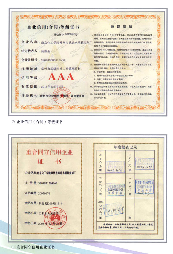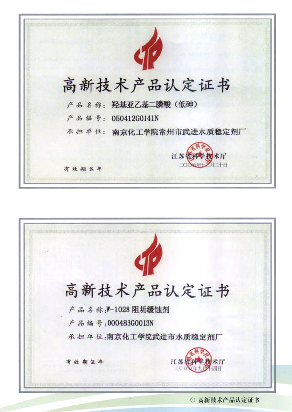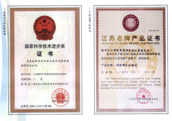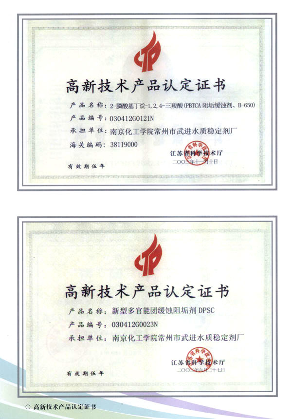 企業(yè)運(yùn)用嚴(yán)密的科學(xué)管理,配有先進(jìn)的工藝技術(shù)和精良的生產(chǎn)裝備,保持高標(biāo)準(zhǔn)的產(chǎn)品質(zhì)量。所生產(chǎn)的水質(zhì)穩(wěn)定劑達(dá)到或超過國際先進(jìn)水平,擁有PBTCA等多個江蘇省高新技術(shù)產(chǎn)品,DPSC緩蝕阻垢劑被列為國家星火計劃項(xiàng)目,工業(yè)循環(huán)水用新型緩蝕阻垢殺菌劑被國務(wù)院評為國家科技進(jìn)步二等獎。主要產(chǎn)品均通過部、省級科技成果鑒定,連續(xù)十多年被中國石化總公司評定為合格推薦產(chǎn)品。企業(yè)已通過IS09001、IS014001國際質(zhì)量、環(huán)境認(rèn)證,為國內(nèi)外石化行業(yè)、冶金、鋼鐵、化肥、電力、紡織等領(lǐng)域的工業(yè)循環(huán)冷卻水的水質(zhì)處理提供了必不可少的配套產(chǎn)品。