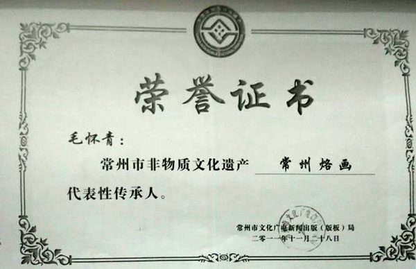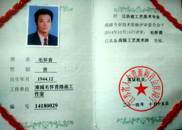 毛懷青,江蘇常州市武進(jìn)人。 中國(guó)工藝美術(shù)學(xué)會(huì)會(huì)員,常州市中國(guó)烙畫研究會(huì)副會(huì)長(zhǎng),常州市文博鑒賞協(xié)會(huì)理事,非物質(zhì)文化遺產(chǎn)烙畫傳承人。高級(jí)工藝美術(shù)師。 年輕時(shí)學(xué)習(xí)國(guó)畫、油畫中年蔓現(xiàn)掌州咯畫源遠(yuǎn)流長(zhǎng)、歷史悠久,有著其它美術(shù)門類不具備的藝術(shù)風(fēng)格與特色。可謂是工藝美術(shù)中的一朵十分亮麗的藝術(shù)奇葩,是我民族先人給我們留下的一份不可多得十分珍貴的一份文化遺產(chǎn)。為弘揚(yáng)與發(fā)展這份優(yōu)秀文化遺產(chǎn),我從此下定決心研究烙畫,愿付出一份力量為振興烙畫事業(yè)做出貢獻(xiàn)。至今已潛心研究幾十年,取得了可喜的成績(jī),被業(yè)界公認(rèn),社會(huì)關(guān)注與認(rèn)可。有“江南烙畫第一筆”之美譽(yù)。 近年來,創(chuàng)作的烙畫作品分別獲得過全國(guó)、省市級(jí)的金、銀、銅獎(jiǎng)多次。中央電視臺(tái)曾兩次播放過本人的烙畫作品,江蘇電視臺(tái)、常州電視臺(tái)也曾多次播放過本人的作品與烙畫藝術(shù)生涯,揚(yáng)子晚報(bào)、常州日?qǐng)?bào)、常州晚報(bào)也曾多次報(bào)導(dǎo)過本人的烙畫作品,出版物有三種版本都能查閱到介紹本的烙畫從藝生涯與藝術(shù)業(yè)績(jī)。