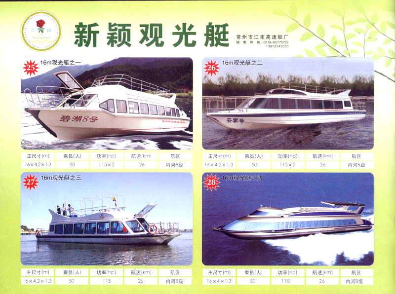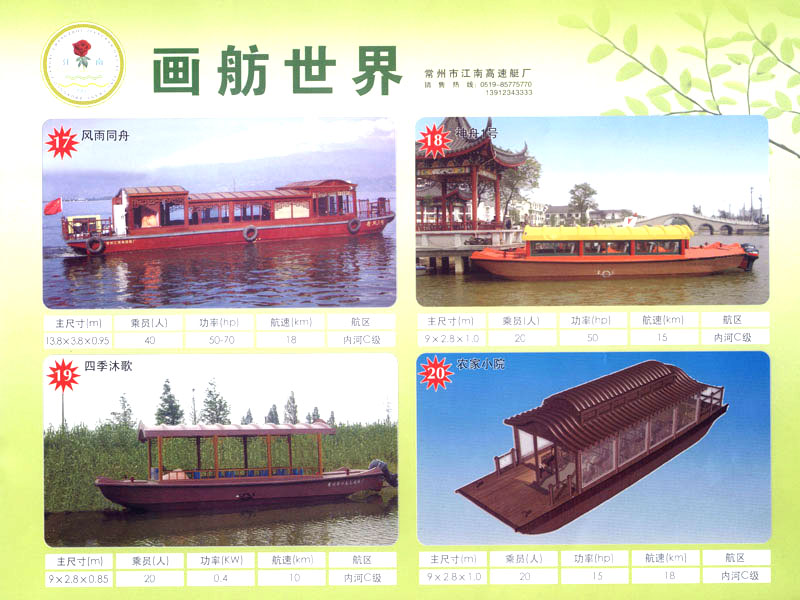 隨著人民生活的提高和水上旅游業(yè)的不斷發(fā)展,原有的游艇已遠不能滿足人民群眾不斷提高的需求。為適應(yīng)水上旅游業(yè)市場的變 化,我廠開發(fā)研制了符合中國國情、具有民族特色的仿古畫舫游艇及國際最新流行款式一城市旅游休閑觀光艇。特別近兩年又開發(fā)了一批精品畫舫船投放市場之后深受景區(qū)的歡迎。今年我廠又開發(fā)了適用少數(shù)民族的“風(fēng)雨橋”、“寨門”畫舫艇。在湖南、廣西、云南、貴州深受愛戴。此艇別具風(fēng)格,民族風(fēng)情特別濃厚。侗鄉(xiāng)一號計劃在2006年5月1日投放在貴州黎平侗鄉(xiāng)風(fēng)景區(qū)八舟河景區(qū)使有(風(fēng)序號)。我廠歡迎用戶來圖加工,來廠考察訂貨,畫舫艇款式多多,終有一款適合你。歡迎來電來函垂詢。索樣即寄。誠心銷售、人情化服務(wù)、企業(yè)文化、精品畫舫。