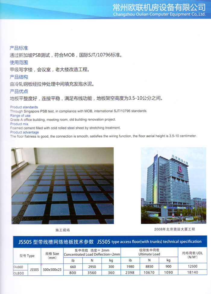 防靜電高架活動地板、全鋼地板、陶瓷地板是計算機行業(yè)發(fā)展起來的新型鋪地材料,隔離了潮氣、靜電灰塵,最重要的是解決了綜合布線問題,無需預(yù)埋管線,可隨時拆卸、搬移,保證了資訊設(shè)備完整的優(yōu)點,適應(yīng)了智能化樓宇中信息自動化技術(shù)對所處環(huán)境的特定要求,避免了廣大客戶的雙重投資,使現(xiàn)代化辦公程度更加高效,辦公場所更加舒適。 “歐聯(lián)”系列全鋼地板,符合國家安全要求,種類完備多樣,其中防靜電陶瓷地板、硫酸鈣地板等除具有普通瓷質(zhì)的裝飾和實用性外,其耐磨、防水、防火功能優(yōu)于其它同類產(chǎn)品,防靜電系列地板,能切合不同客戶的要求,其靈活的配置,深受客戶歡迎,不同材質(zhì)的地板結(jié)構(gòu)使設(shè)計師的設(shè)計空間比傳統(tǒng)的更加廣闊自由和善變。 公司大力發(fā)展國內(nèi)外銷售業(yè)務(wù),多次中標(biāo)國內(nèi)重點工程 ,例:哈爾濱醫(yī)科大學(xué)、山東大學(xué)、上海普通機場等。 公司將一如既往開發(fā)和制造一流的產(chǎn)品,愿與廣大有識之士合作發(fā)展,共創(chuàng)美好未來。