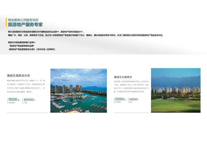 一、立足北上廣,面向全中國(guó),走向全世界 1992年,雅居樂(lè)物業(yè)開(kāi)篇中山,率先引入港式物業(yè)管理模式。1997年,依托雅居樂(lè)地產(chǎn)的崛起,連續(xù)接管中山多個(gè)項(xiàng)目,成為高端大盤(pán)物業(yè)管理的領(lǐng)跑者。1999年,雅居樂(lè)物業(yè)開(kāi)啟專(zhuān)業(yè)化發(fā)展模式,全面通過(guò)英國(guó)皇家BSI的ISO9000質(zhì)量管理體系認(rèn)證,2001年成為國(guó)家首批一級(jí)物業(yè)管理資質(zhì)企業(yè)。 2002年,隨著廣州雅居樂(lè)花園的盛大啟幕,雅居樂(lè)物業(yè)邁開(kāi)向廣州進(jìn)軍的步伐。為尋求更長(zhǎng)遠(yuǎn)的發(fā)展,雅居樂(lè)積極構(gòu)思上市藍(lán)圖,2005年在香港成功上市。在深耕珠三角城市群的同時(shí),2006年雅居樂(lè)物業(yè)揮師北上,正式開(kāi)啟全國(guó)部署戰(zhàn)略。2008年,接管海南清水灣項(xiàng)目,揭開(kāi)旅游地產(chǎn)物業(yè)管理的新篇章。 接下來(lái)近十年里,雅居樂(lè)物業(yè)始終保持著最年輕的成長(zhǎng)姿態(tài),依托“管理數(shù)字化、服務(wù)專(zhuān)業(yè)化、流程標(biāo)準(zhǔn)化和操作機(jī)械化”的發(fā)展戰(zhàn)略,雅居樂(lè)物業(yè)榮膺2018中國(guó)物業(yè)服務(wù)百?gòu)?qiáng)企業(yè)第11名,2018年中國(guó)物業(yè)服務(wù)百?gòu)?qiáng)企業(yè)成長(zhǎng)性第二名、2018年中國(guó)物業(yè)服務(wù)百?gòu)?qiáng)服務(wù)質(zhì)量領(lǐng)先企業(yè)、2018年中國(guó)物業(yè)服務(wù)百?gòu)?qiáng)滿(mǎn)意度領(lǐng)先企業(yè)、2018中國(guó)物業(yè)服務(wù)百?gòu)?qiáng)經(jīng)營(yíng)績(jī)效領(lǐng)先企業(yè)、旅游地產(chǎn)物業(yè)管理領(lǐng)先品牌、2018年中國(guó)辦公物業(yè)管理優(yōu)秀企業(yè)(綠地物業(yè))、2017中國(guó)物業(yè)管理企業(yè)品牌價(jià)值第12名、2017中國(guó)物業(yè)管理企業(yè)綜合實(shí)力第12名、中國(guó)藍(lán)籌物業(yè)企業(yè)、《旅游地產(chǎn)物業(yè)管理服務(wù)標(biāo)準(zhǔn)》(團(tuán)體標(biāo)準(zhǔn))起草工作等多項(xiàng)殊榮。 目前,雅生活集團(tuán)已形成廣州、中山、深圳、南京、上海、西安、成都、海南、云南、北京、鄭州、南寧、沈陽(yáng)、武漢、馬來(lái)西亞十五大城市公司全面發(fā)展的蓬勃態(tài)勢(shì)。截止2017年12月31日,雅生活集團(tuán)管理范圍覆蓋全國(guó)逾69座城市與地區(qū),服務(wù)類(lèi)型涵蓋主流住宅、高端豪宅、旅游地產(chǎn)、商業(yè)、寫(xiě)字樓等多種業(yè)態(tài),合約總建筑面積為12610萬(wàn)平方米,擁有200多個(gè)項(xiàng)目,服務(wù)業(yè)主逾100萬(wàn)人。 2017年6月,雅生活集團(tuán)收購(gòu)綠地物業(yè)100%股權(quán),并與綠地集團(tuán)簽署戰(zhàn)略合作協(xié)議,8月,綠地集團(tuán)投資10億元獲得雅生活集團(tuán)20%股權(quán)。未來(lái),雅生活集團(tuán)將實(shí)施“雅居樂(lè)物業(yè)”與“綠地物業(yè)”雙品牌驅(qū)動(dòng)戰(zhàn)略,還將尋求在A股上市,力爭(zhēng)打造中國(guó)物業(yè)“A+H”第一股。