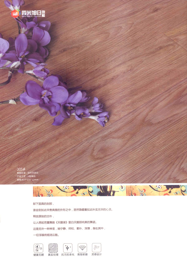 品牌保證,質(zhì)量放心 公司旗下“霞光.旭日”品牌地板系列由旭日皇家、旭日經(jīng)典、旭日戀家、至尊奢華、巧奪天工、水晶陶瓷等幾個系列構(gòu)成,配有專職質(zhì)量檢驗人員,嚴(yán)把產(chǎn)品質(zhì)量關(guān),不斷完善產(chǎn)品質(zhì)量體系、監(jiān)控管理體系。公司對客戶需求全面、科學(xué)、準(zhǔn)確地把握,確保對客戶市場適時高效反應(yīng)。一流的設(shè)備、精心的選材、完美的工藝以及對產(chǎn)品品味不倦的追求,令奔公司產(chǎn)品獨樹一幟。
