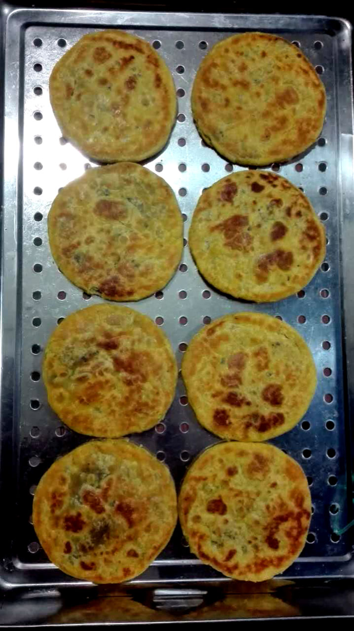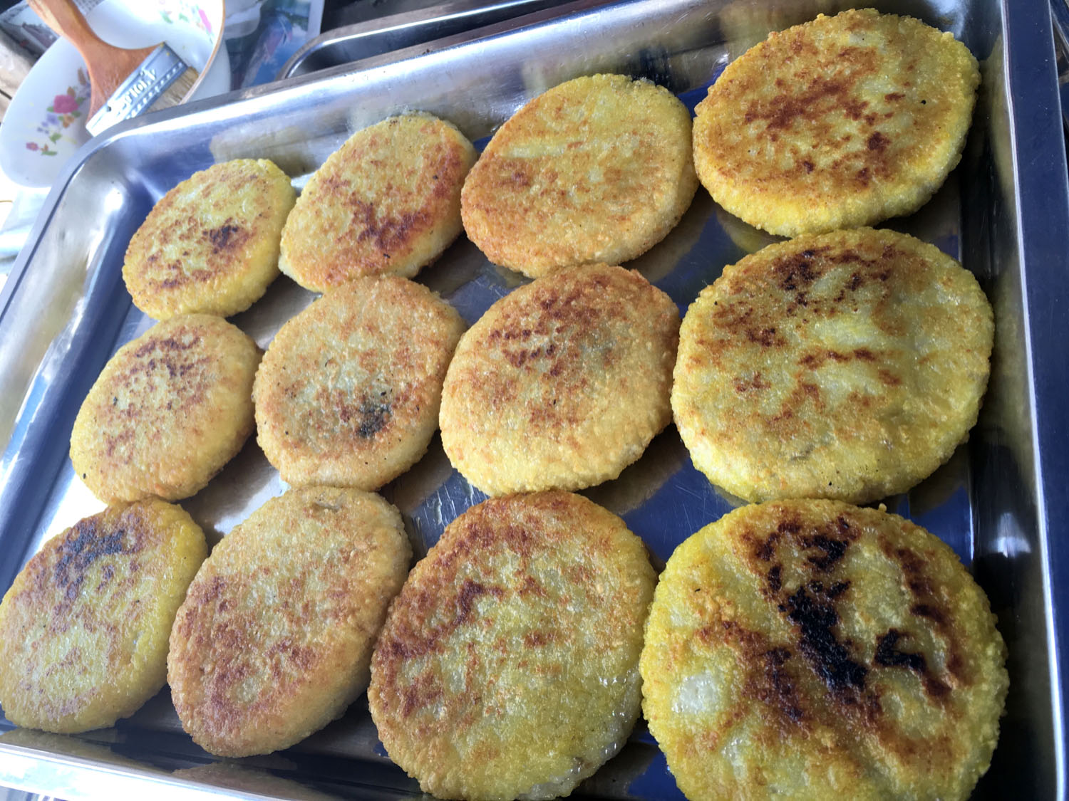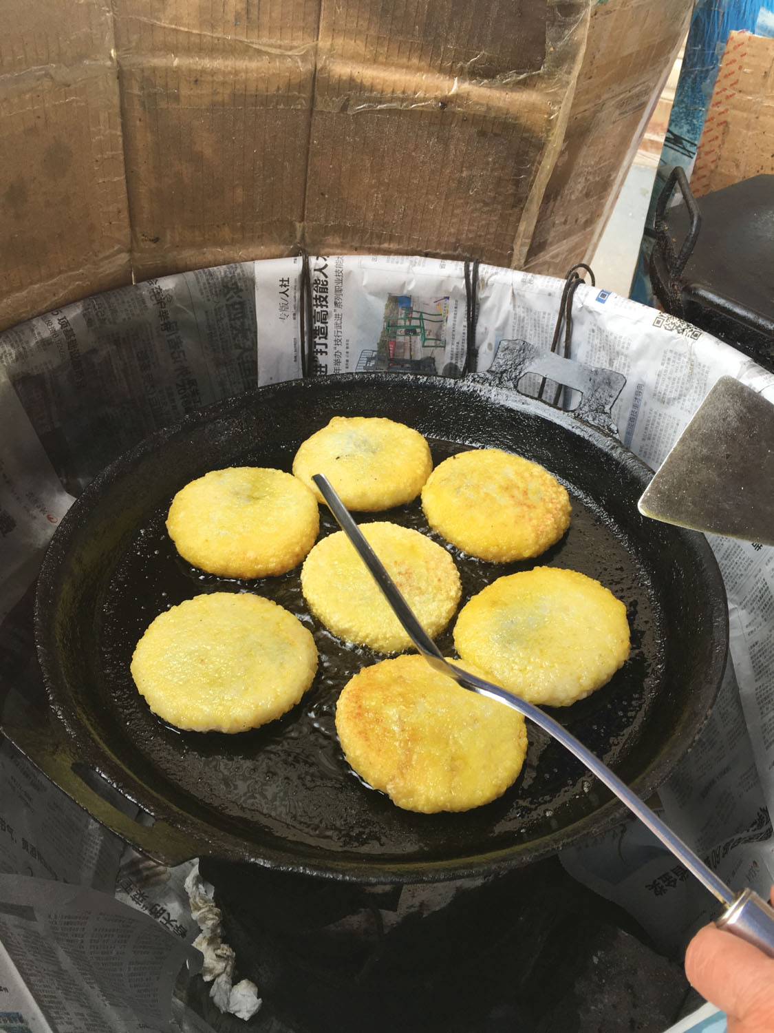 油酥餅(圖3-4)、糍團(tuán)餅(圖5-6)、韭菜餅(圖7-8)   油酥餅每天晚上做,涼了更好吃,更酥更脆,里面都是很香的黑芝麻;糍團(tuán)餅,每天中午擺攤熱了煎鍋開始煎,糯米做成,用菜籽油煎至金黃,餡兒是黑芝麻瓜子仁;韭菜餅是最受歡迎的,每天都有好多人排隊(duì)來買。供應(yīng)時(shí)間:每年的4月份到11月份 下午1點(diǎn)到5點(diǎn)半。