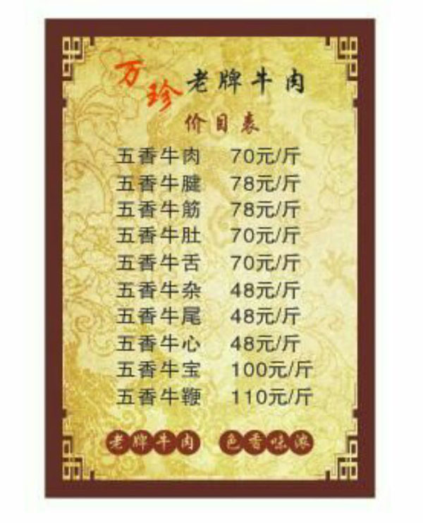 老牌牛肉創(chuàng)始人徐德洪始于1935年在常州東大街八仙浴室門(mén)口,以挑擔(dān)擺攤賣(mài)牛肉為生,1952年移至縣直街開(kāi)設(shè)了徐德洪牛肉店。1958年公私合營(yíng)改名為四時(shí)興牛肉店。文化大革命后又改名為立新牛肉店,1979年退休。他一生加工經(jīng)常五香牛肉,選料精良,工藝講究,配方獨(dú)到,牛肉色香味濃,味道純正鮮美,百吃不厭。長(zhǎng)期以來(lái),深得廣大顧客的一致好評(píng)和喜愛(ài),成為常州城家喻戶(hù)曉的老字號(hào)。 徐萬(wàn)珍乃徐德洪之女,傳承父業(yè),秉承父親精益求精的優(yōu)良傳統(tǒng),于1997年在同濟(jì)橋開(kāi)設(shè)了萬(wàn)珍老牌牛肉店,經(jīng)營(yíng)至今二十載,嚴(yán)格選料把關(guān),遵循傳統(tǒng)加工工藝,不加工任何添加劑,繼承和保留了老牌牛肉的傳統(tǒng)特色和傳統(tǒng)老味道,色香味濃,原汁原味,得到了更多新老顧客的青睞。