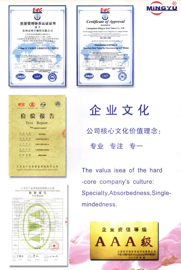 常州市明宇鋼管有限公司位于江南水鄉(xiāng)常州與無錫之間,緊臨滬寧高速,312國道,沿江高速,錫宜高速,京杭大運(yùn)河,交通極為方便。 公司創(chuàng)建于1992年,固定資產(chǎn)2500萬元,車間面積15000平方米,現(xiàn)有職工220人,技術(shù)員30人,穿孔機(jī)組外徑40-80兩套,冷拔機(jī)組10T-80T八套,輥底式熱處理爐一套,形成年產(chǎn)30000噸各類無縫鋼管的生產(chǎn)能力。另有半自動鋼鋸切割機(jī)八臺,儀表倒角機(jī)18臺,電鍍鋅槽3條,形成從切割、倒角、電鍍的鋼管深加工能力,年產(chǎn)紡機(jī)牽伸管、紗管、編織機(jī)筒管1000萬支的生產(chǎn)能力。 集行業(yè)之精華,全新的設(shè)備,完備的檢測手段,嚴(yán)格的管理措施,良好的服務(wù)宗旨,高素質(zhì)的員工隊伍,在多年的生產(chǎn)實(shí)踐經(jīng)驗基礎(chǔ)上,保障了出廠產(chǎn)品的質(zhì)量,以質(zhì)量求生存,以信譽(yù)求市場,以科技求發(fā)展,以價格求客戶的經(jīng)營理念,竭誠為社會各界用戶提供一流服務(wù)。
