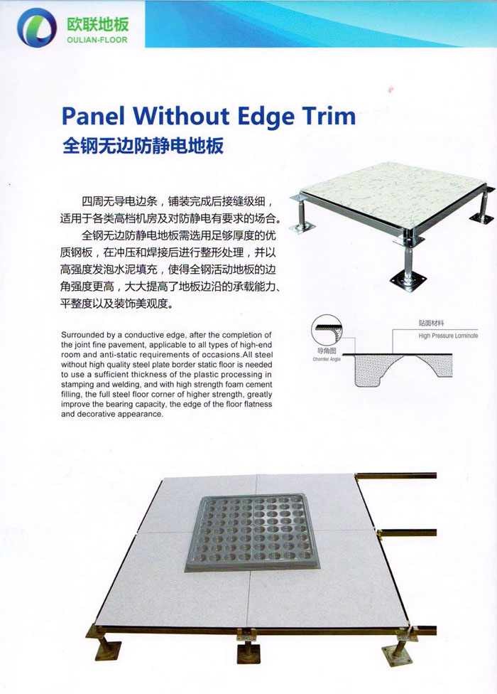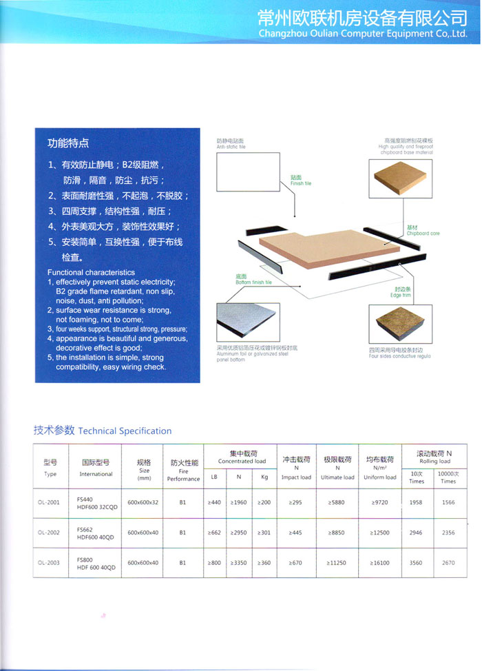 防靜電高架活動地板、全鋼地板、陶瓷地板是計算機行業(yè)發(fā)展起來的新型鋪地材料,隔離了潮氣、靜電灰塵,最重要的是解決了綜合布線問題,無需預(yù)埋管線,可隨時拆卸、搬移,保證了資訊設(shè)備完整的優(yōu)點,適應(yīng)了智能化樓宇中信息自動化技術(shù)對所處環(huán)境的特定要求,避免了廣大客戶的雙重投資,使現(xiàn)代化辦公程度更加高效,辦公場所更加舒適。 “歐聯(lián)”系列全鋼地板,符合國家安全要求,種類完備多樣,其中防靜電陶瓷地板、硫酸鈣地板等除具有普通瓷質(zhì)的裝飾和實用性外,其耐磨、防水、防火功能優(yōu)于其它同類產(chǎn)品,防靜電系列地板,能切合不同客戶的要求,其靈活的配置,深受客戶歡迎,不同材質(zhì)的地板結(jié)構(gòu)使設(shè)計師的設(shè)計空間比傳統(tǒng)的更加廣闊自由和善變。 公司大力發(fā)展國內(nèi)外銷售業(yè)務(wù),多次中標(biāo)國內(nèi)重點工程 ,例:哈爾濱醫(yī)科大學(xué)、山東大學(xué)、上海普通機場等。 公司將一如既往開發(fā)和制造一流的產(chǎn)品,愿與廣大有識之士合作發(fā)展,共創(chuàng)美好未來。