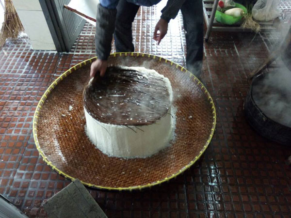 第三步:拌入酒曲,這時候才發(fā)現(xiàn)了“木桶”的神奇之處:一頭空,另一頭也是空,只不過用鋼筋做了個柵欄。之前蒸米飯,老徐是墊上了蒲草,一方面讓糯米飯更易熟,另一方面也增加了糯米飯的清香氣息。把糯米飯倒入蠶匾中,邊翻動糯米飯邊撒上酒曲,使酒曲與糯米飯充分拌勻。