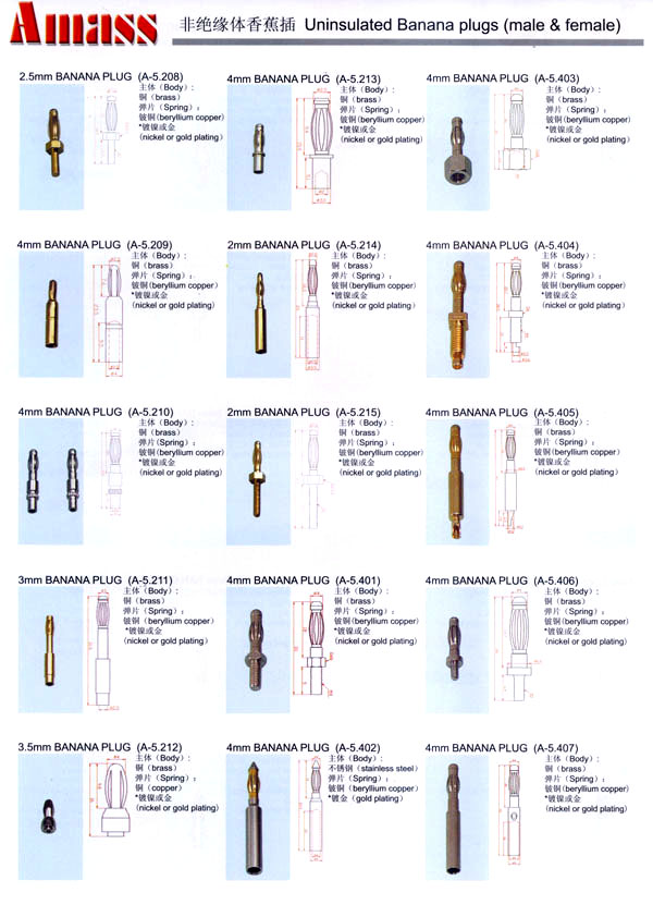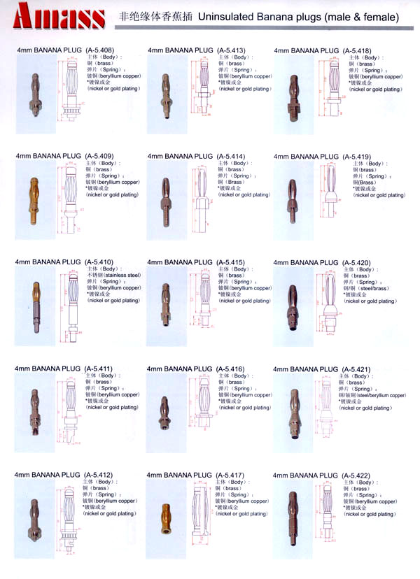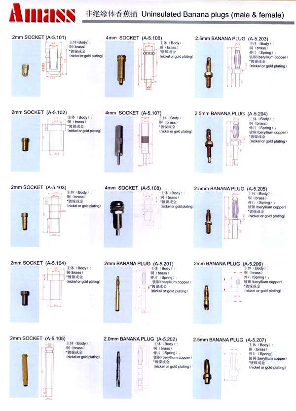 本公司專業(yè)生產(chǎn)各類香蕉插頭,香蕉插座,接線柱,電瓶夾,鱷魚夾,測試導(dǎo)線,測試筆等。產(chǎn)品分2mm/2.5mm/3mm/3.5mm/4mm五大系列,百余種款式, 各種香蕉插廣泛用于儀器、儀表、電力測試、教學(xué)、玩具,視聽設(shè)備、醫(yī)療儀器,保健產(chǎn)品等領(lǐng)域。公司技術(shù)力量雄厚,生產(chǎn)工藝先進(jìn),產(chǎn)品遠(yuǎn)銷港、臺、歐美,并與飛利浦等國際品牌配套。公司本著精益求精的理念,歡迎新老客戶光臨。