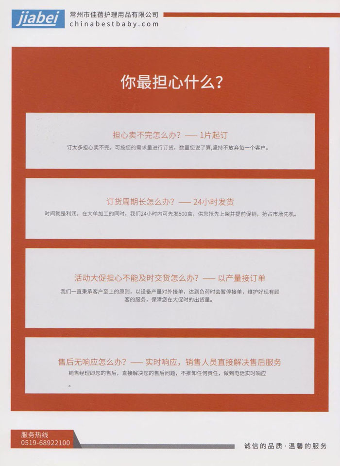 常州市佳蓓護(hù)理用品有限公司是一家專(zhuān)業(yè)從事開(kāi)發(fā)、生產(chǎn)、銷(xiāo)售并具備自營(yíng)出口的外向型企業(yè),主要生產(chǎn)“一次性防溢乳墊“,以質(zhì)量穩(wěn)定,柔軟親膚而深受客戶和消費(fèi)者青睞。本公司產(chǎn)品從生產(chǎn)到包裝成品嚴(yán)格執(zhí)行無(wú)菌生產(chǎn)標(biāo)準(zhǔn)化流程,并和設(shè)備生產(chǎn)廠家合作開(kāi)發(fā)了兩條從進(jìn)料、生產(chǎn)、檢測(cè)、滅菌、成品包裝的無(wú)菌生產(chǎn)線,從而實(shí)現(xiàn)了真正意義上的無(wú)菌生產(chǎn)標(biāo)準(zhǔn)化。 佳蓓秉承”用戶至上“的原則,期待與國(guó)內(nèi)外客戶真誠(chéng)合作,同時(shí)也誠(chéng)邀品牌公司貼牌合作,歡迎您的蒞臨和指導(dǎo),與我們攜手合作,共創(chuàng)未來(lái)。
