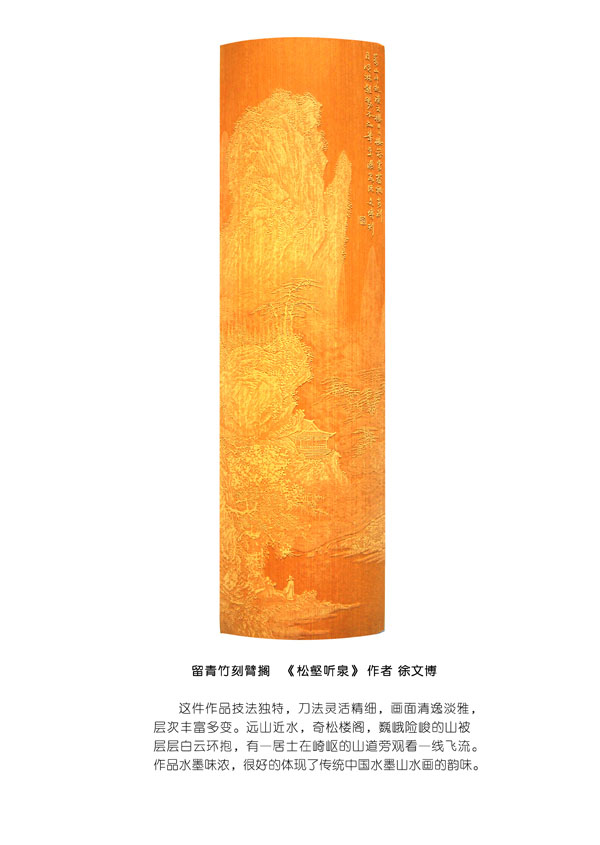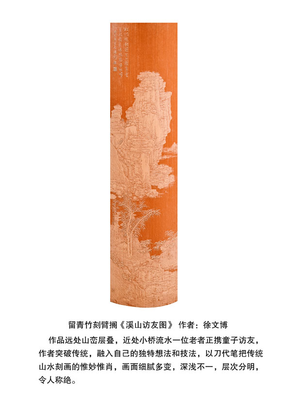 徐博(藝名文博),1973年生,江蘇武進(jìn)人,江蘇省省名人,高級(jí)工藝美術(shù)師,常州市留青竹刻非遺傳承人,常州工藝美術(shù)家協(xié)會(huì)理事,被譽(yù)為當(dāng)今中國(guó)最具創(chuàng)新意識(shí)的新銳竹刻家代表,多次獲得國(guó)家工藝美術(shù)大獎(jiǎng)?釔哿羟嘀窨痰男煳牟┵p竹為樂,以竹詠志,借竹抒懷,悉心探索留青竹刻的藝術(shù)表現(xiàn)。在中國(guó)工藝美術(shù)大師蕭劍波的精心指導(dǎo)下,開創(chuàng)留青水墨山水之技法,更好的體現(xiàn)了竹刻淡雅清秀的藝術(shù)風(fēng)格,并不斷汲取書畫、攝影、雕塑等藝術(shù)精華,不斷滋養(yǎng)藝術(shù)情趣,提升擴(kuò)展胸襟人格的同時(shí)也逐步形成了其形神兼?zhèn)洌搶?shí)相生,氣韻生動(dòng)的藝術(shù)特點(diǎn),作品為眾多的國(guó)內(nèi)外收藏家珍藏。
