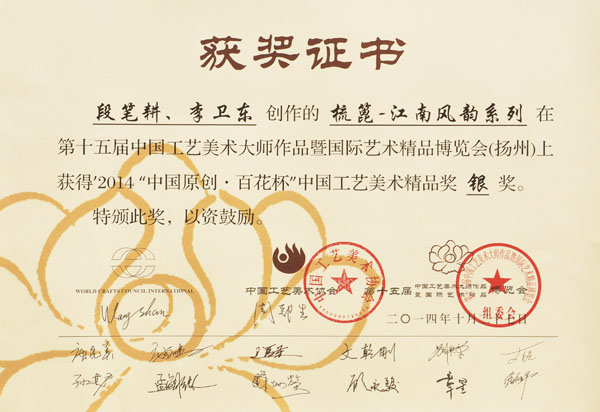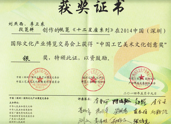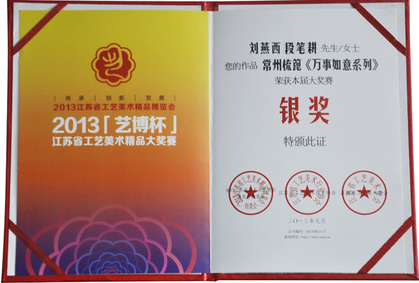 公司榮譽介紹: “2009年常州市旅游商品創(chuàng)新設計大賽”,“覽盡千荷”綠檀雕刻梳榮獲三等獎; “2011年常州市旅游商品創(chuàng)新設計大賽”,“彩印工藝梳-我們的年代(80)”榮獲二等獎。 “2011年中國包裝創(chuàng)意設計大賽“,虞美人彩印梳篦系列包裝獲得一等獎; “2011年中國包裝創(chuàng)意設計大賽”,虞美人筷子系列包裝獲得三等獎; “2011創(chuàng)意中國.第五屆設計藝術大獎賽”,虞美人系列包裝獲得三等獎; “2011首屆中國(無錫)國際文化藝術博覽會”,漆藝對梳《喜玫瑰》獲得“藝博杯“銅獎。 “第十三屆中國工藝美術大師作品暨國際藝術精品博覽會”, 漆藝梳《報喜鳥》榮獲2012“儒士儒家•百花杯”中國工藝美術精品獎優(yōu)秀獎 “第十三屆中國工藝美術大師作品暨國際藝術精品博覽會”, 虞美人《渾然天成》榮獲2012“儒士儒家•百花杯”中國工藝美術精品獎金獎 “2012江蘇省工藝美術精品大獎賽”,虞美人《S型梳》喜獲“藝博杯”銀獎 “第十四屆中國工藝美術大師作品暨國際藝術精品博覽會”, 虞美人工藝梳《新型十二星座梳》榮獲2013“國信•百花杯”中國工藝美術精品獎優(yōu)秀獎 “2013【藝博杯】江蘇省工藝美術精品大獎賽”,虞美人《萬事如意系列》喜獲“藝博杯”銀獎 “2013江蘇省工藝美術新人新作成果展作品大獎賽”,虞美人《壺(福)的藝術》喜獲“藝博杯”入圍獎 2013年度江蘇省“蘇商領袖峰會”,常州市卓尚飾品有限公司榮獲最具成長性企業(yè)獎 常州市卓尚飾品(虞美人)有限公司總經(jīng)理李衛(wèi)東榮獲“常州創(chuàng)意產(chǎn)業(yè)協(xié)會2013年底慈善獎榮譽” 常州市卓尚飾品有限公司榮獲薛家鎮(zhèn)人民政府2013年度“創(chuàng)新創(chuàng)優(yōu)”獎 常州市卓尚飾品有限公司榮獲薛家鎮(zhèn)人民政府2013年度“銷售業(yè)績”獎 2014中國(深圳)國際文化產(chǎn)業(yè)博覽交易會,劉燕西、李衛(wèi)東、段筆耕<十二星座系列>獲得“中國工藝美術文化創(chuàng)意獎”銀獎 2014中國(深圳)國際文化產(chǎn)業(yè)博覽交易會,徐德鴻、李衛(wèi)東、段筆耕《漆彩人生系列》獲得“中國工藝美術文化創(chuàng)意獎”銅獎 文化創(chuàng)意大獎賽“紫金獎” ,有余(魚)系列梳篦產(chǎn)品獲得了優(yōu)秀獎 2014吟飛杯首屆常州文化創(chuàng)意和設計大賽,虞美人有余(魚)系列梳篦產(chǎn)品榮獲優(yōu)秀設計獎 2014吟飛杯首屆常州文化創(chuàng)意和設計大賽,虞美人“云,月”系列梳篦產(chǎn)品榮獲優(yōu)秀設計獎 2014藝博杯江蘇省工藝美術精品大獎賽,虞美人《梳篦:酒醉的探戈》喜獲銀獎 2014“中國原創(chuàng)•百花杯”中國工藝美術精品大獎賽,虞美人《梳篦-江南風韻系列》喜獲銀獎 常州市卓尚飾品有限公司獲“2014年常州市電子商務協(xié)會2014年度優(yōu)秀會員單位” 2014“虞美人”成為常州市知名商標。