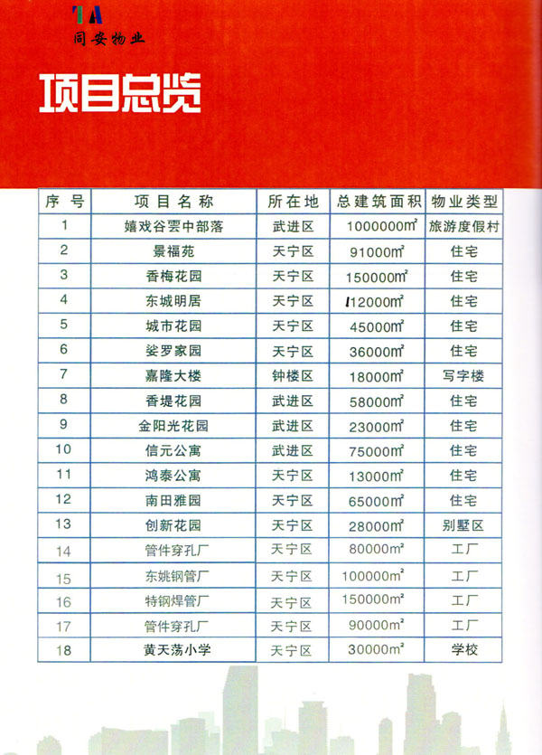常州市同安物業(yè)管理有限公司注冊(cè)1999年,發(fā)展至今已有多年歷史,本公司坐落于美麗的龍城常州,秉承“融聚無(wú)限未來(lái)”的核心理念,融專業(yè)認(rèn)才,匯優(yōu)質(zhì)資源以”專心,細(xì)心,耐心”的服務(wù)態(tài)度,為客戶打造“安心,順心,稱心”的服務(wù)感受。 公司始終以“打造中國(guó)最值得信賴和最值得尊重的物業(yè)管理服務(wù)集成商”為愿景自我鞭策,不斷前行。同安物業(yè)以客戶滿意為終極目標(biāo),不斷加強(qiáng)”崗位資格認(rèn)證能力,人才招聘與職業(yè)化培訓(xùn)能力,產(chǎn)品策劃與管理設(shè)計(jì)能力,品質(zhì)監(jiān)督與管控能力,技術(shù)更新與運(yùn)營(yíng)優(yōu)化力“五大專業(yè)能力的培養(yǎng)和提升,實(shí)現(xiàn)“精品化管理,專業(yè)化服務(wù)”。 公司發(fā)展至今,員工總數(shù)近千余人,大專以上學(xué)歷200多人,中高級(jí)技術(shù)人員160人,維修人員140人,物業(yè)管理師80名,公司接管面積達(dá)3100000多平方米,設(shè)涉及住宅小區(qū),別墅,大型游樂(lè)場(chǎng),公園,醫(yī)院,廠區(qū),商業(yè)等。公司的工作管理逐步導(dǎo)入ISO9001質(zhì)量體系和ISO4001環(huán)境管理體系和GB/T28001職業(yè)健康安全管理體系,嚴(yán)格按照質(zhì)量體系的標(biāo)準(zhǔn)執(zhí)行。