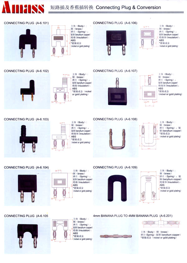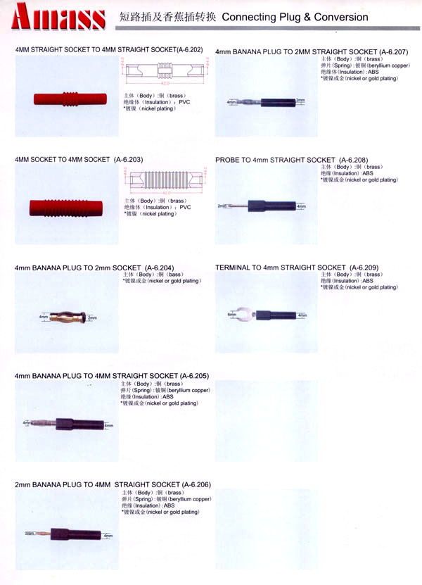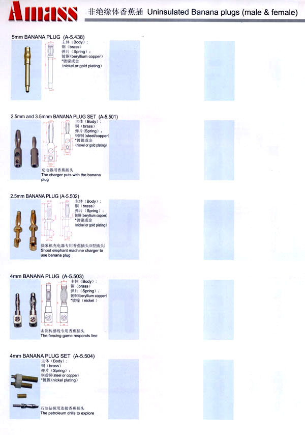 本公司專(zhuān)業(yè)生產(chǎn)各類(lèi)香蕉插頭,香蕉插座,接線柱,電瓶夾,鱷魚(yú)夾,測(cè)試導(dǎo)線,測(cè)試筆等。產(chǎn)品分2mm/2.5mm/3mm/3.5mm/4mm五大系列,百余種款式, 各種香蕉插廣泛用于儀器、儀表、電力測(cè)試、教學(xué)、玩具,視聽(tīng)設(shè)備、醫(yī)療儀器,保健產(chǎn)品等領(lǐng)域。公司技術(shù)力量雄厚,生產(chǎn)工藝先進(jìn),產(chǎn)品遠(yuǎn)銷(xiāo)港、臺(tái)、歐美,并與飛利浦等國(guó)際品牌配套。公司本著精益求精的理念,歡迎新老客戶光臨。 我們擁有資深的工程師和豐富的電子產(chǎn)品銷(xiāo)售經(jīng)驗(yàn),專(zhuān)業(yè)生產(chǎn)各類(lèi)電子接插件產(chǎn)品。 香蕉插頭,香蕉插座,電瓶夾,鱷魚(yú)夾等品種齊全、 質(zhì)量可靠,致力服務(wù)于通訊、數(shù)據(jù)通信、消費(fèi)類(lèi)電子產(chǎn)品、計(jì)算機(jī)和計(jì)算機(jī)外圍設(shè)備以及工業(yè)應(yīng)用等領(lǐng)域,能給客戶提供全面采購(gòu)解決方案。 我們秉承穩(wěn)健作風(fēng)、誠(chéng)實(shí)經(jīng)營(yíng)、合理價(jià)格、完善服務(wù)的宗旨,在全體客戶的支持下,公司不斷創(chuàng)新進(jìn)取,業(yè)績(jī)蒸蒸日上,已與數(shù)十家電子零件制造商及其分支機(jī)構(gòu)建立密切合作關(guān)系,在國(guó)內(nèi)擁有數(shù)百家固定客戶。