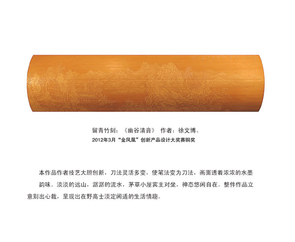 徐博(藝名文博),1973年生,江蘇武進(jìn)人,江蘇省省名人,高級(jí)工藝美術(shù)師,常州市留青竹刻非遺傳承人,常州工藝美術(shù)家協(xié)會(huì)理事,被譽(yù)為當(dāng)今中國(guó)最具創(chuàng)新意識(shí)的新銳竹刻家代表,多次獲得國(guó)家工藝美術(shù)大獎(jiǎng)?釔(ài)留青竹刻的徐文博賞竹為樂(lè),以竹詠志,借竹抒懷,悉心探索留青竹刻的藝術(shù)表現(xiàn)。在中國(guó)工藝美術(shù)大師蕭劍波的精心指導(dǎo)下,開(kāi)創(chuàng)留青水墨山水之技法,更好的體現(xiàn)了竹刻淡雅清秀的藝術(shù)風(fēng)格,并不斷汲取書畫、攝影、雕塑等藝術(shù)精華,不斷滋養(yǎng)藝術(shù)情趣,提升擴(kuò)展胸襟人格的同時(shí)也逐步形成了其形神兼?zhèn),虛?shí)相生,氣韻生動(dòng)的藝術(shù)特點(diǎn),作品為眾多的國(guó)內(nèi)外收藏家珍藏。