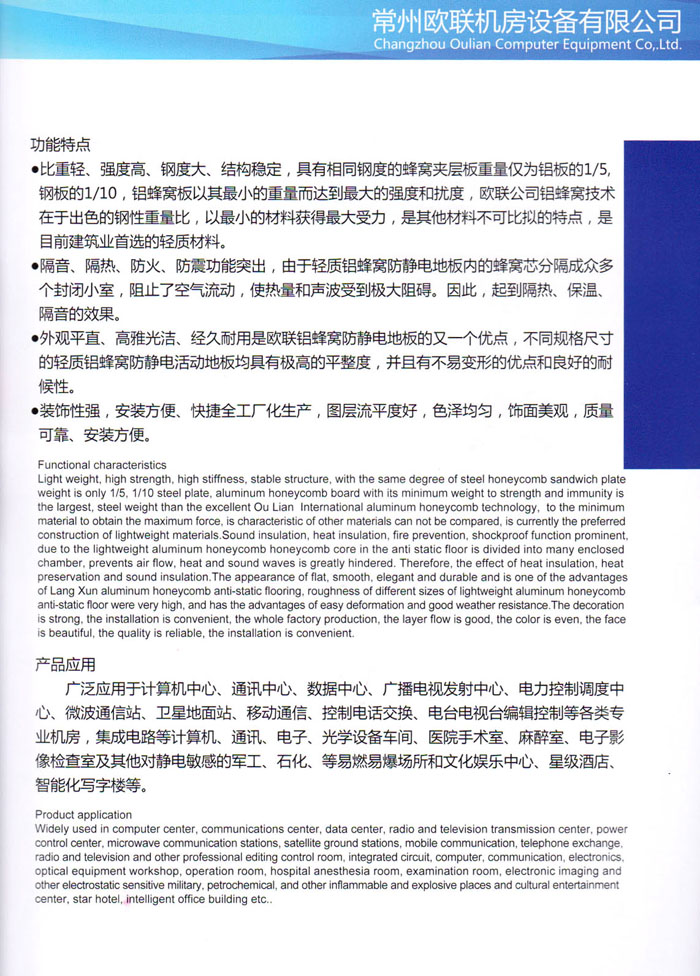 “歐聯(lián)”系列全鋼地板,符合國家安全要求,種類完備多樣,其中防靜電陶瓷地板、硫酸鈣地板等除具有普通瓷質(zhì)的裝飾和實(shí)用性外,其耐磨、防水、防火功能優(yōu)于其它同類產(chǎn)品,防靜電系列地板,能切合不同客戶的要求,其靈活的配置,深受客戶歡迎,不同材質(zhì)的地板結(jié)構(gòu)使設(shè)計(jì)師的設(shè)計(jì)空間比傳統(tǒng)的更加廣闊自由和善變。
