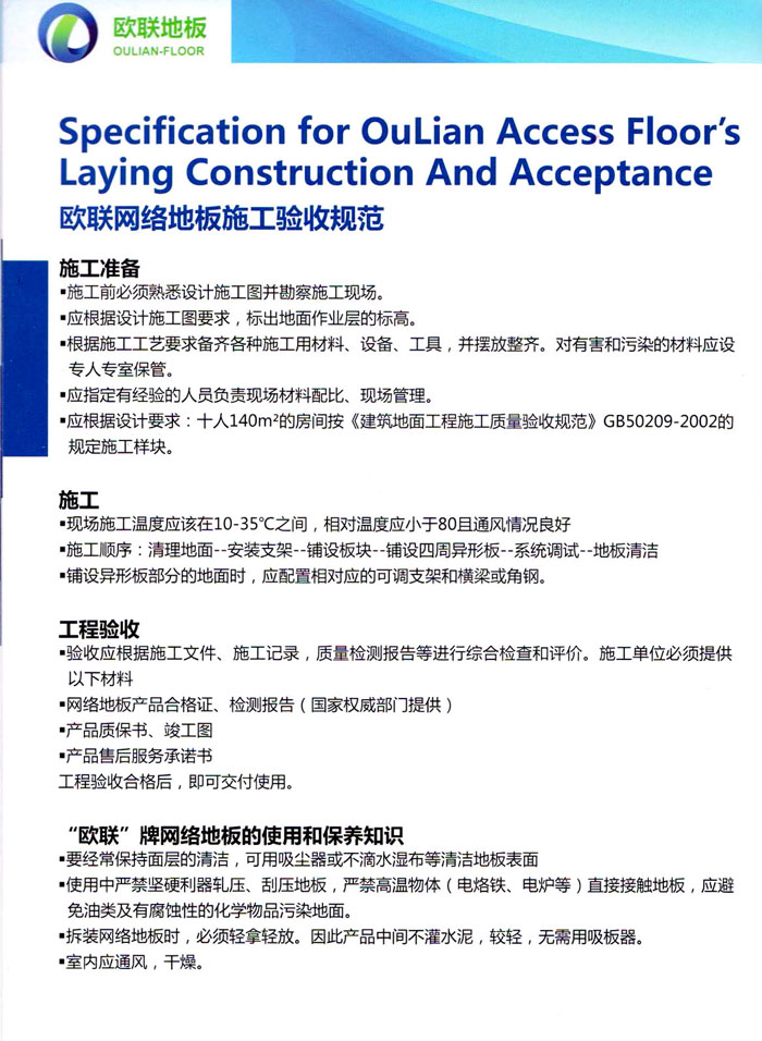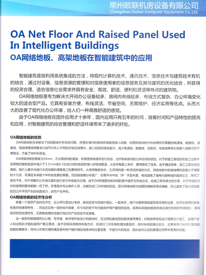 “歐聯(lián)”系列全鋼地板,符合國家安全要求,種類完備多樣,其中防靜電陶瓷地板、硫酸鈣地板等除具有普通瓷質(zhì)的裝飾和實(shí)用性外,其耐磨、防水、防火功能優(yōu)于其它同類產(chǎn)品,防靜電系列地板,能切合不同客戶的要求,其靈活的配置,深受客戶歡迎,不同材質(zhì)的地板結(jié)構(gòu)使設(shè)計(jì)師的設(shè)計(jì)空間比傳統(tǒng)的更加廣闊自由和善變。